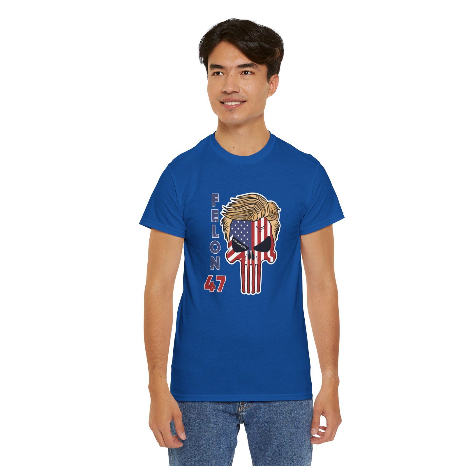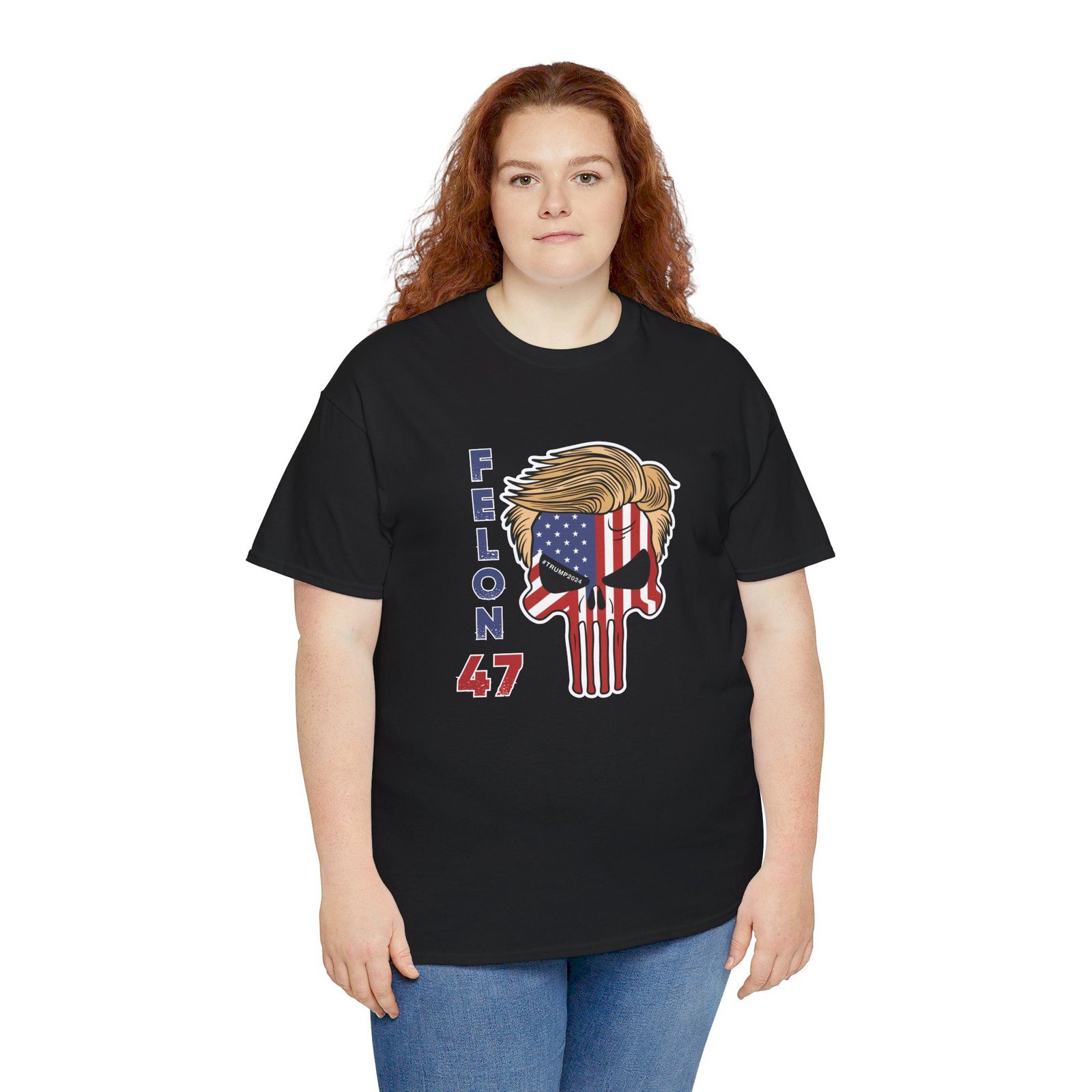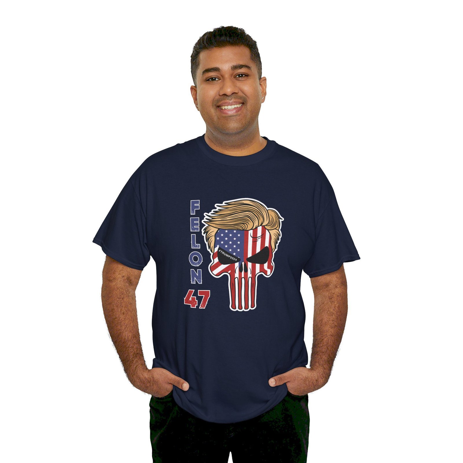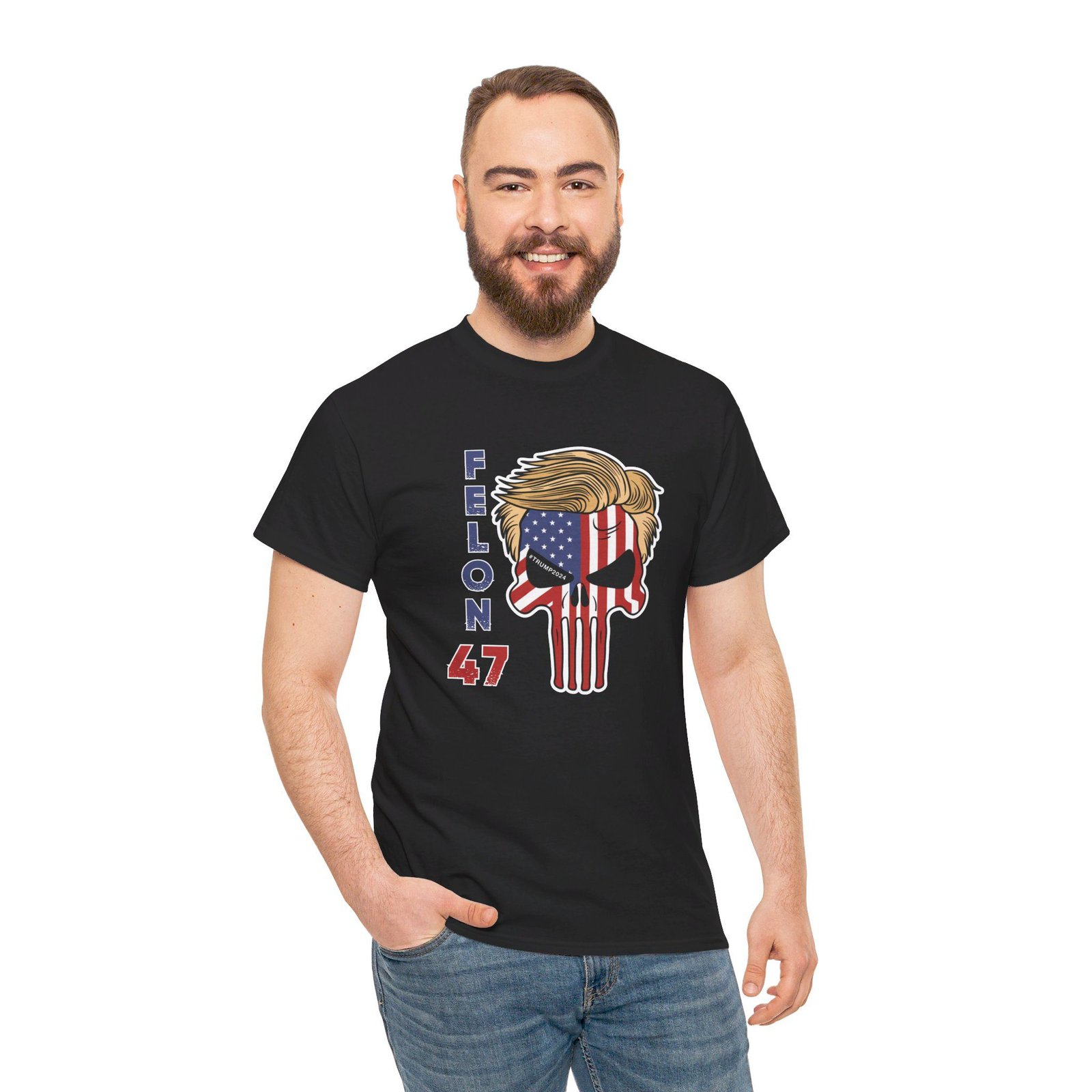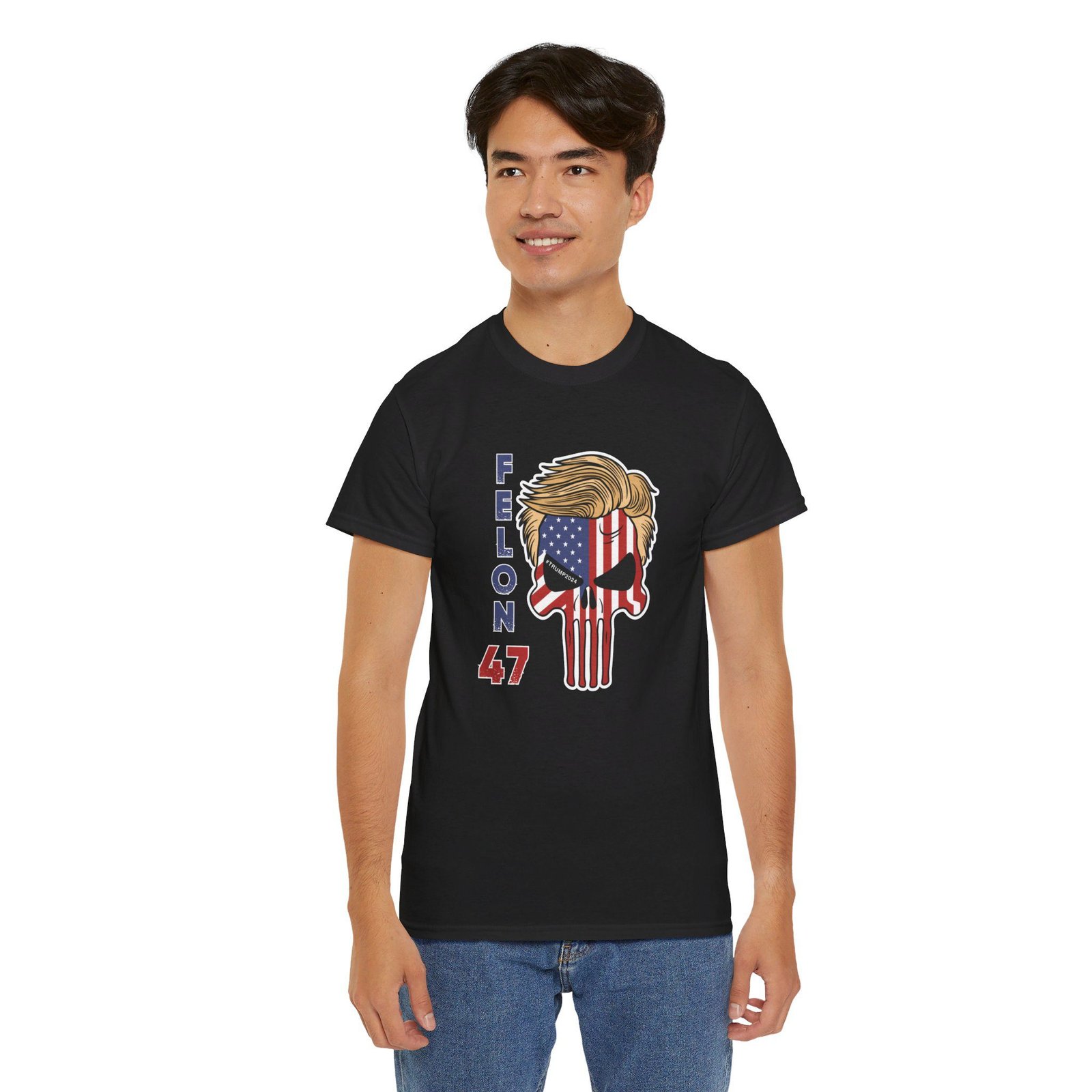 DESIGN: The text “Felon 47” in red and blue. An illustration of a skull embedded with the American Flag and with President Donald Trump’s iconic blonde hairstyle. Colors are white, black, gold, red, blue, etc. Your choice of t-shirt colors.