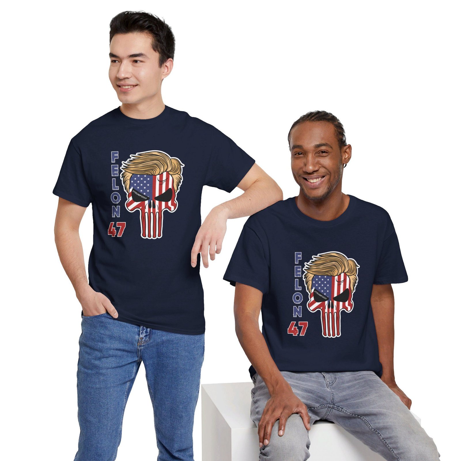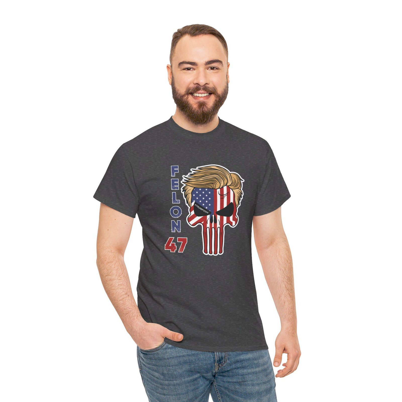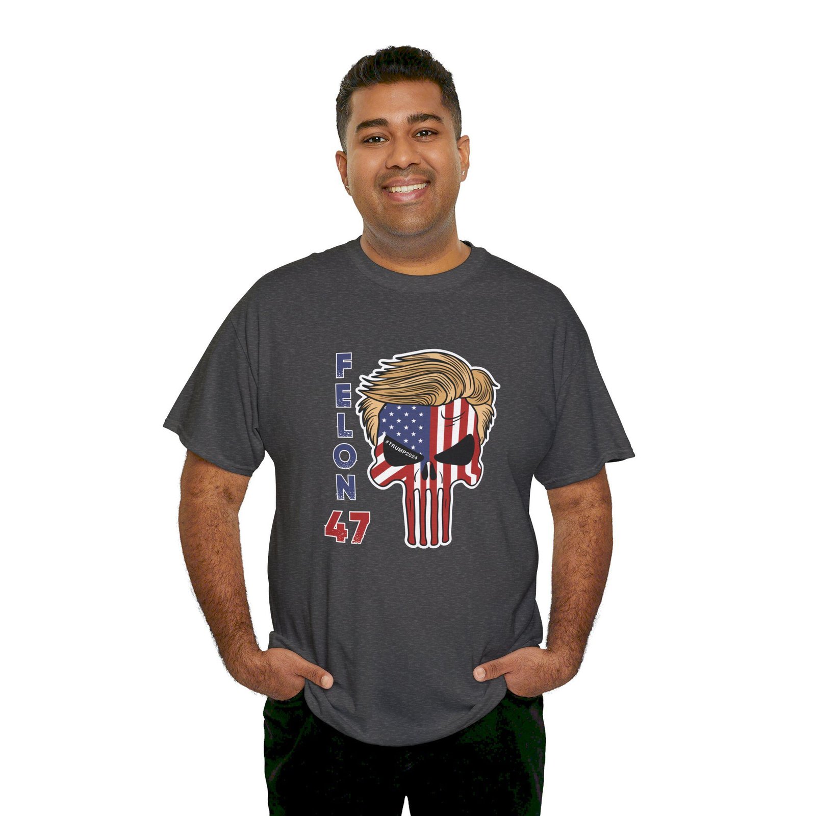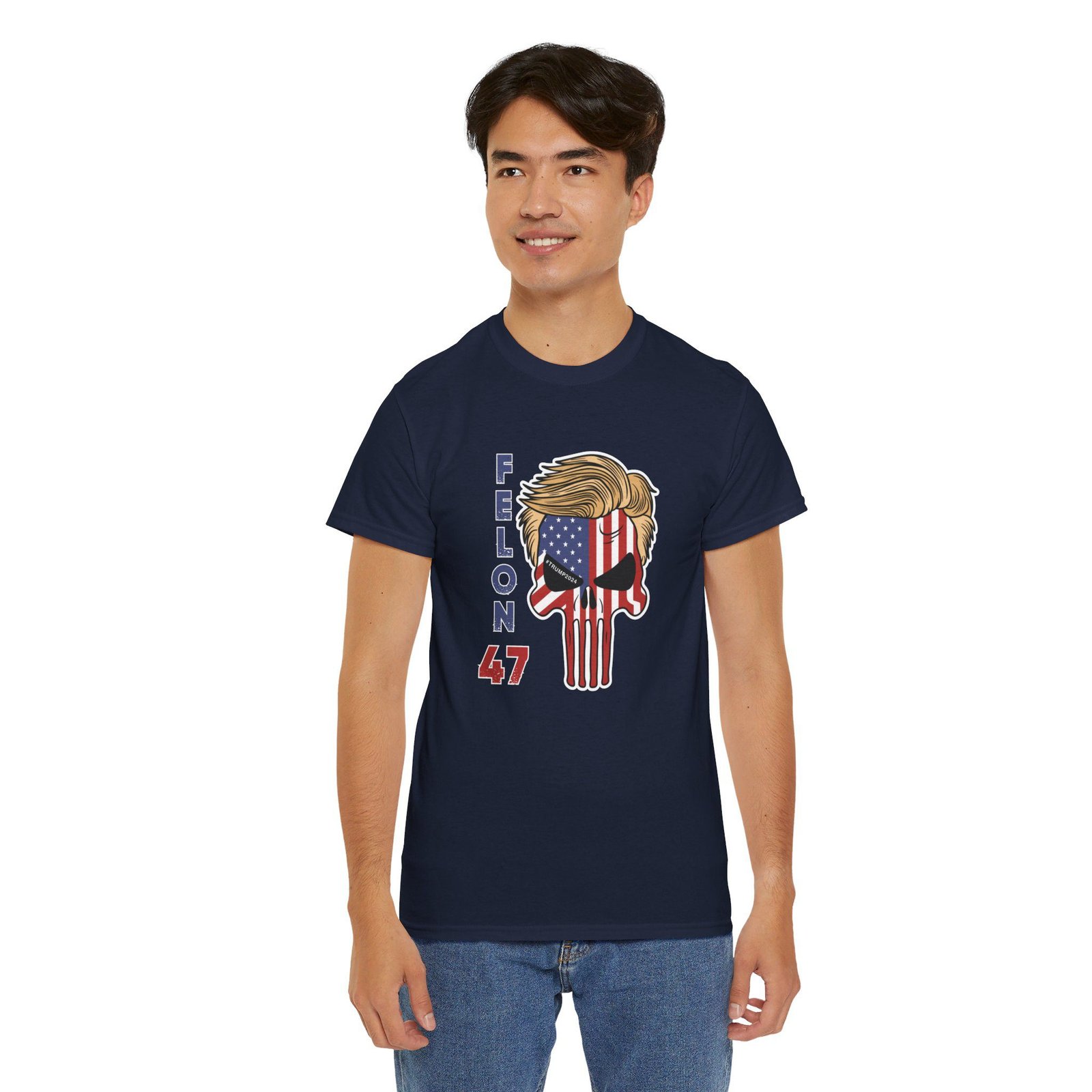 DESIGN: The text “Felon 47” in red and blue. An illustration of a skull embedded with the American Flag and with President Donald Trump’s iconic blonde hairstyle. Colors are white, black, gold, red, blue, etc. Your choice of t-shirt colors.