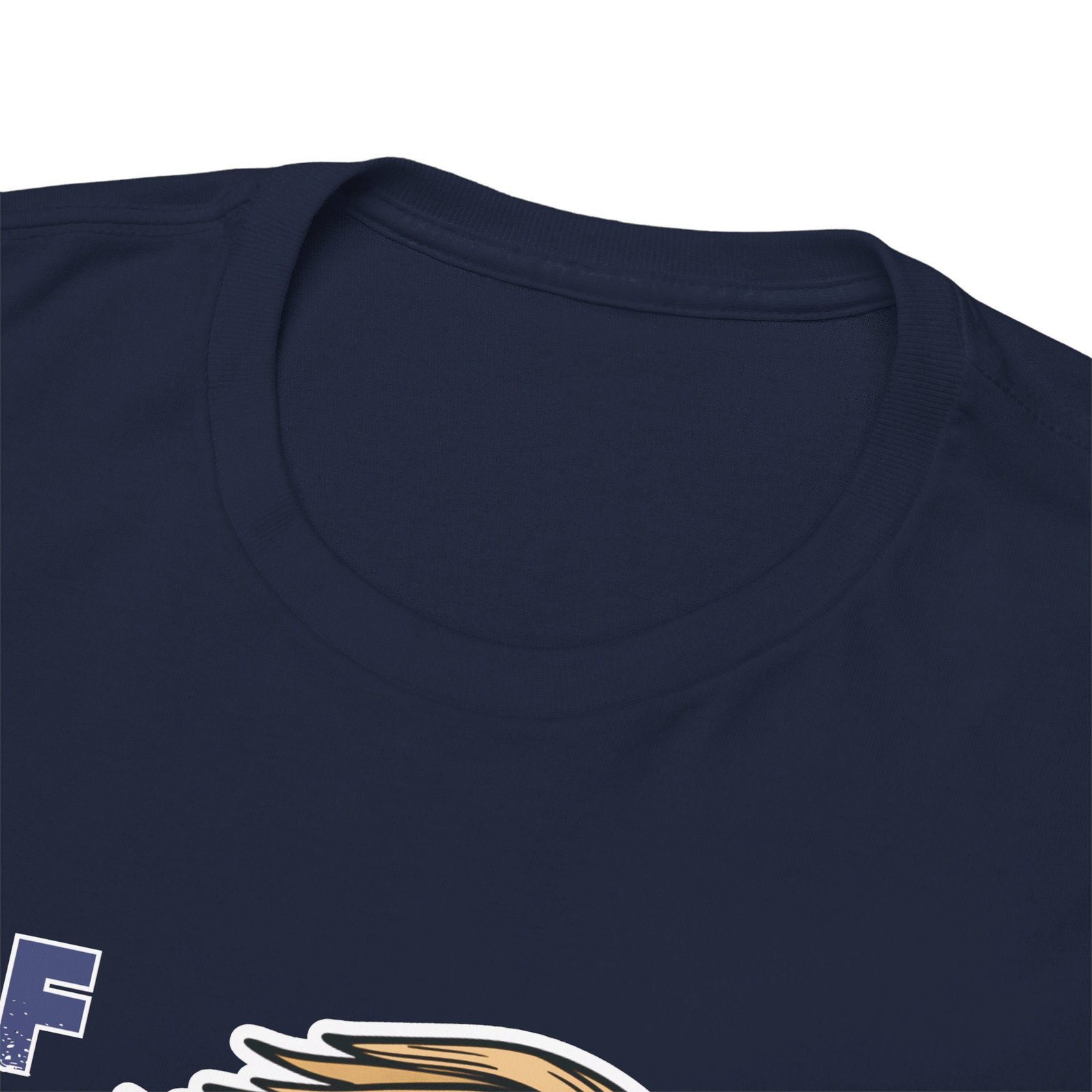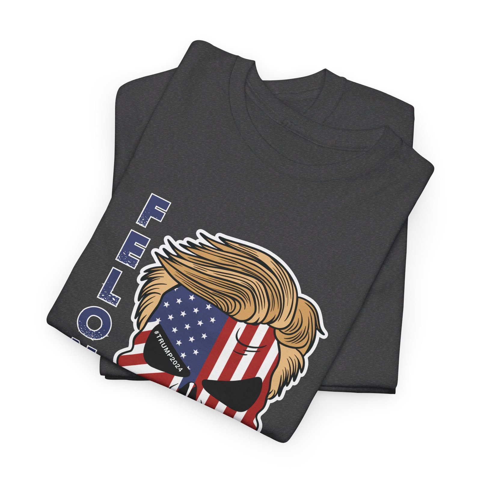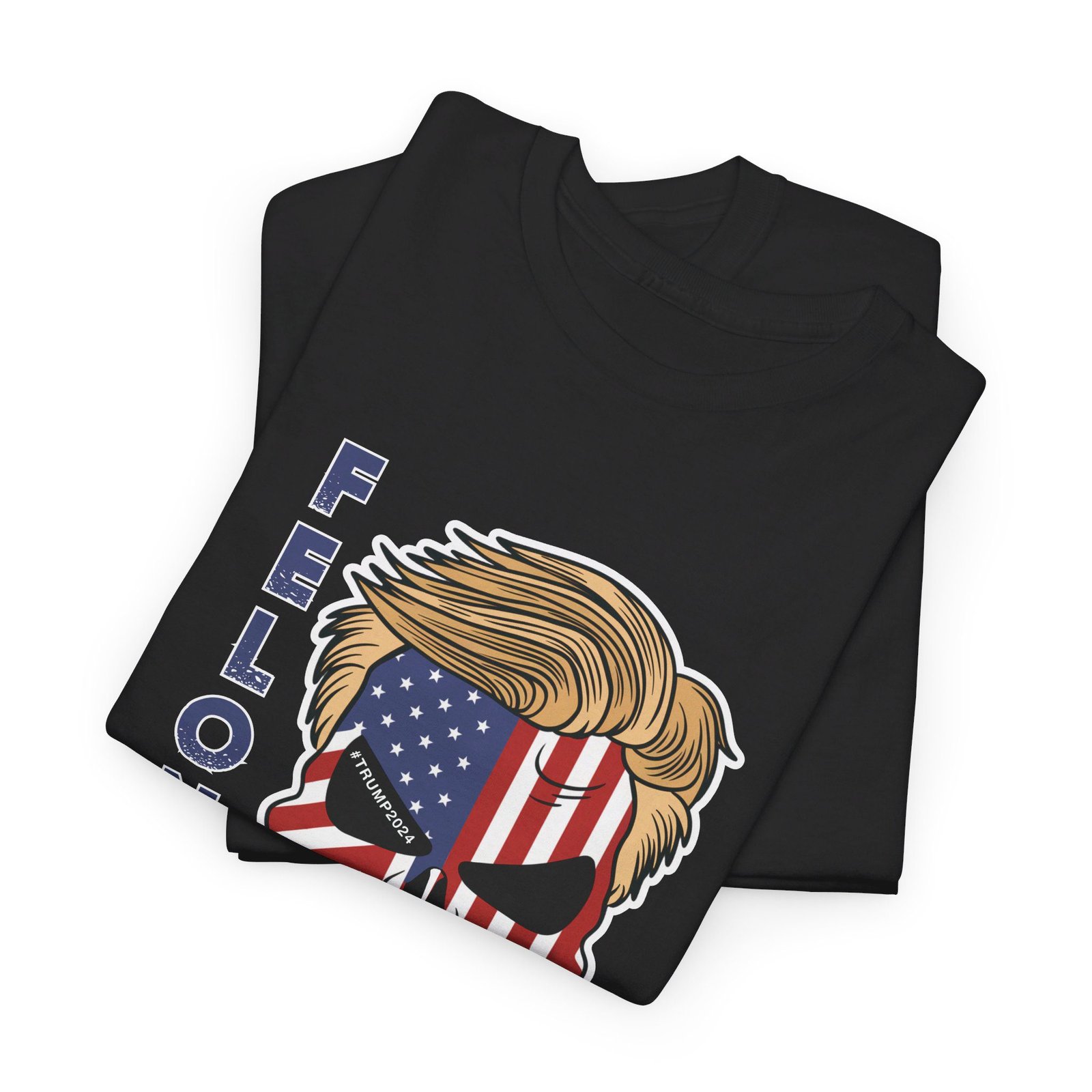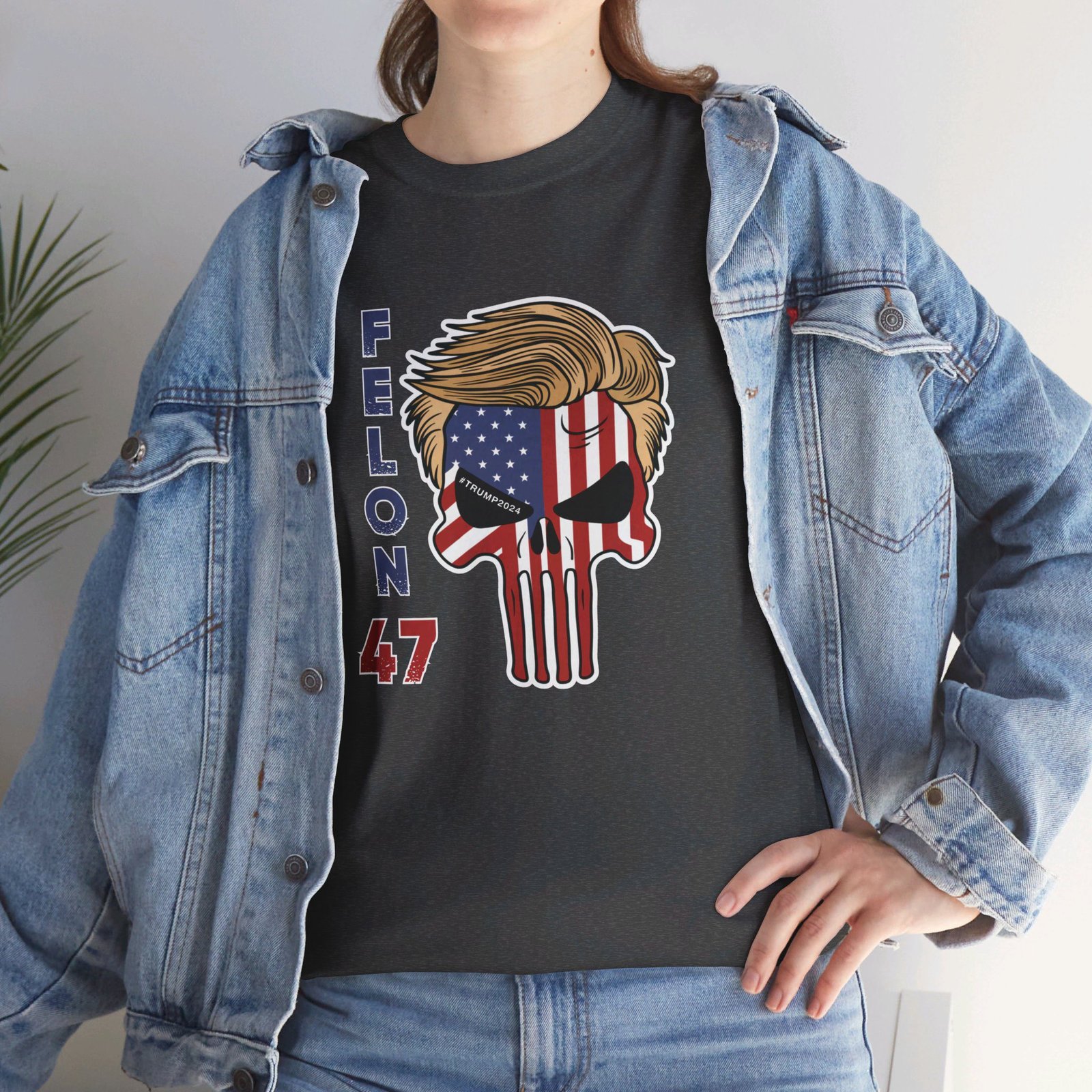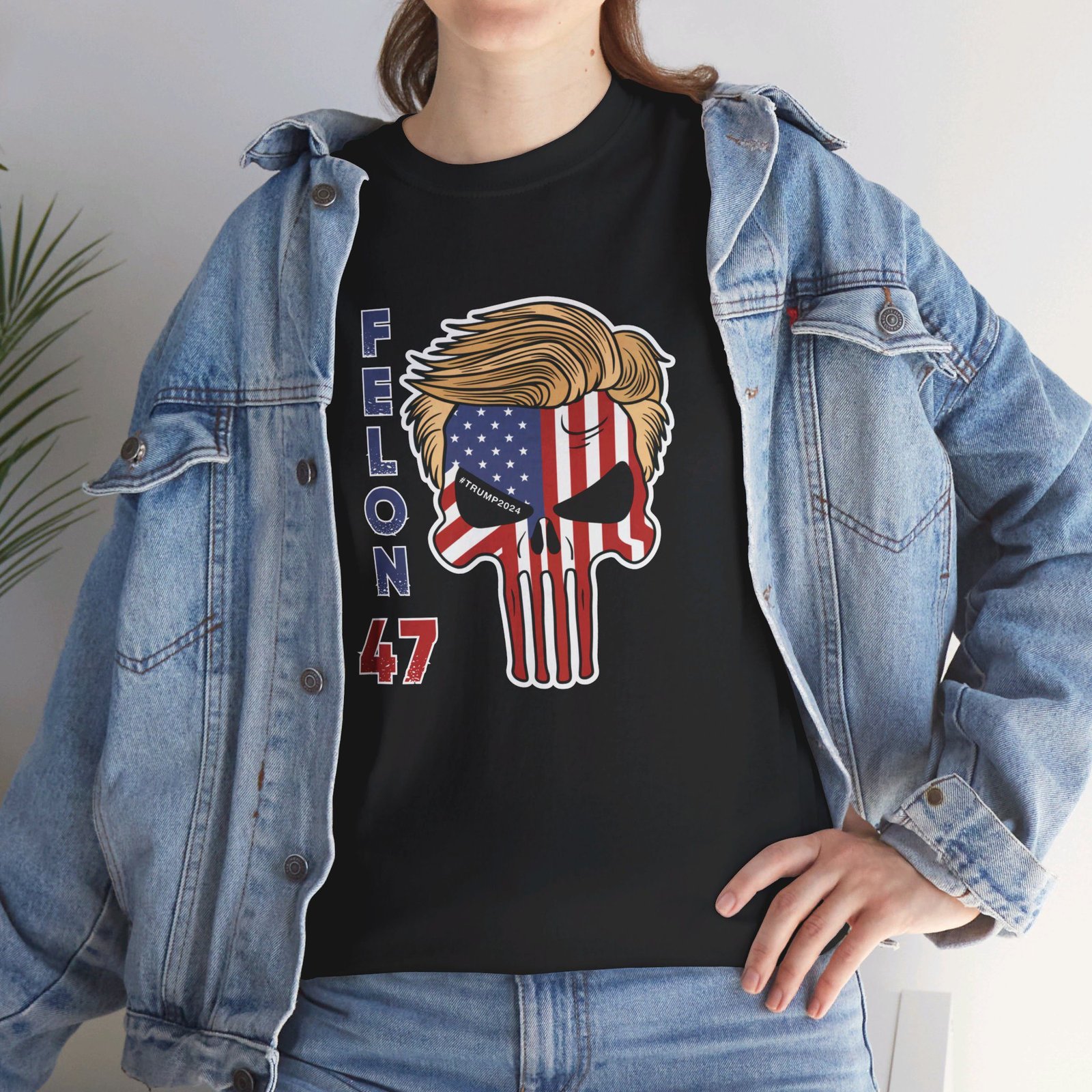 DESIGN: The text “Felon 47” in red and blue. An illustration of a skull embedded with the American Flag and with President Donald Trump’s iconic blonde hairstyle. Colors are white, black, gold, red, blue, etc. Your choice of t-shirt colors.