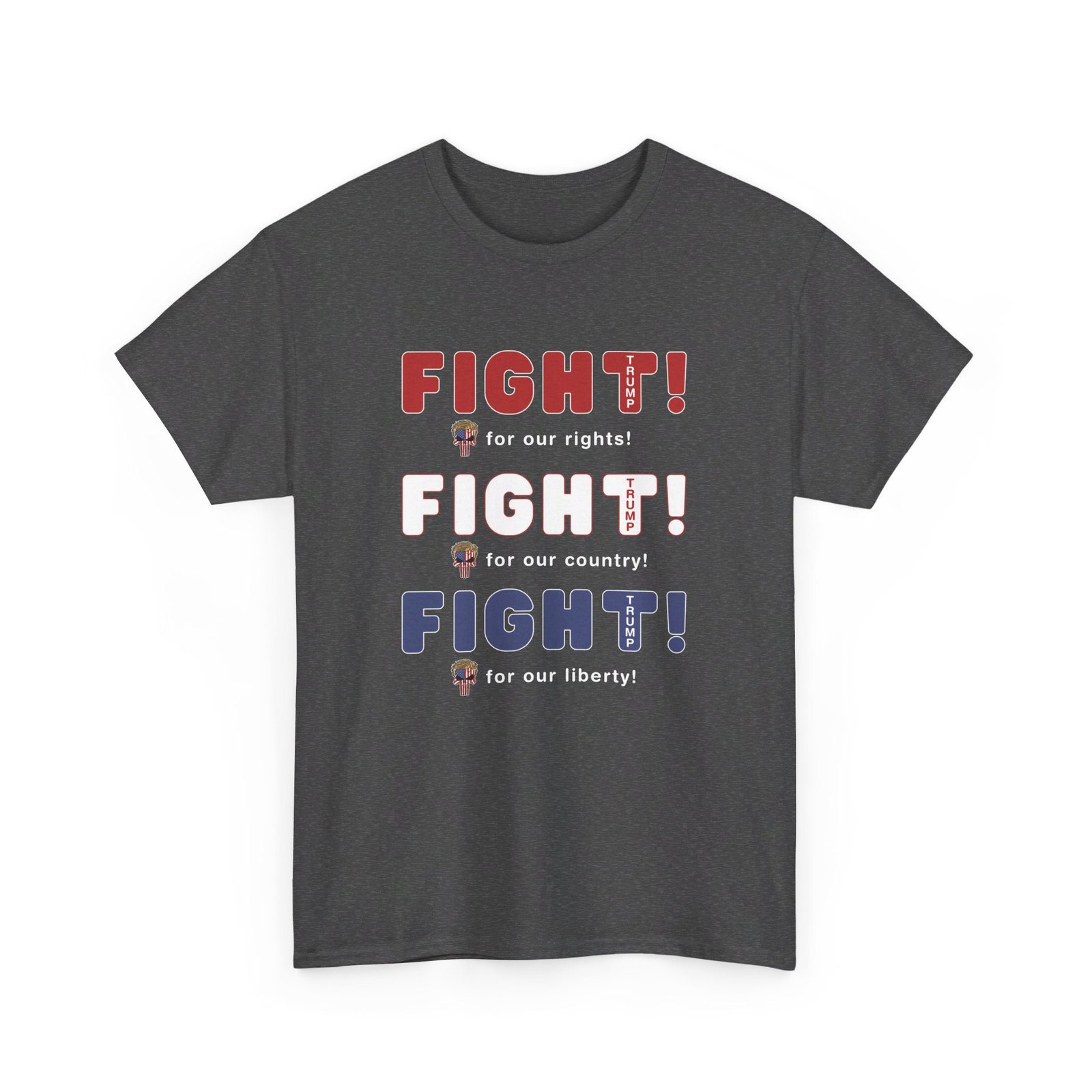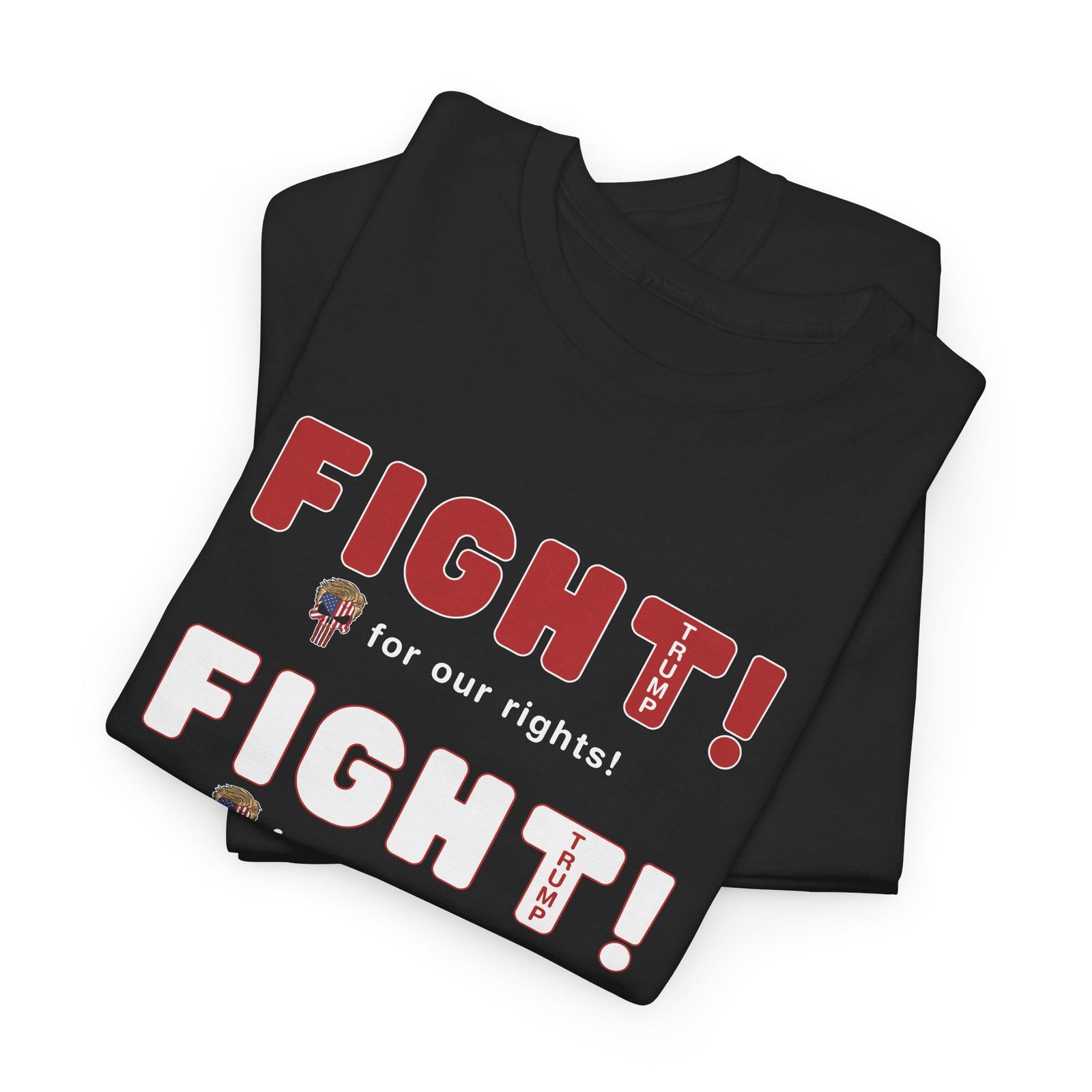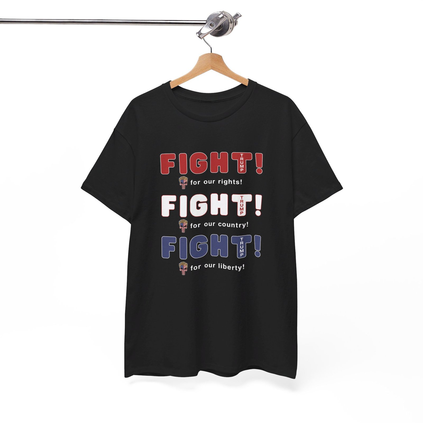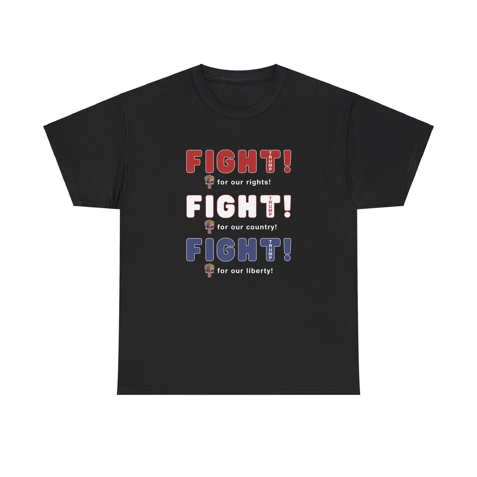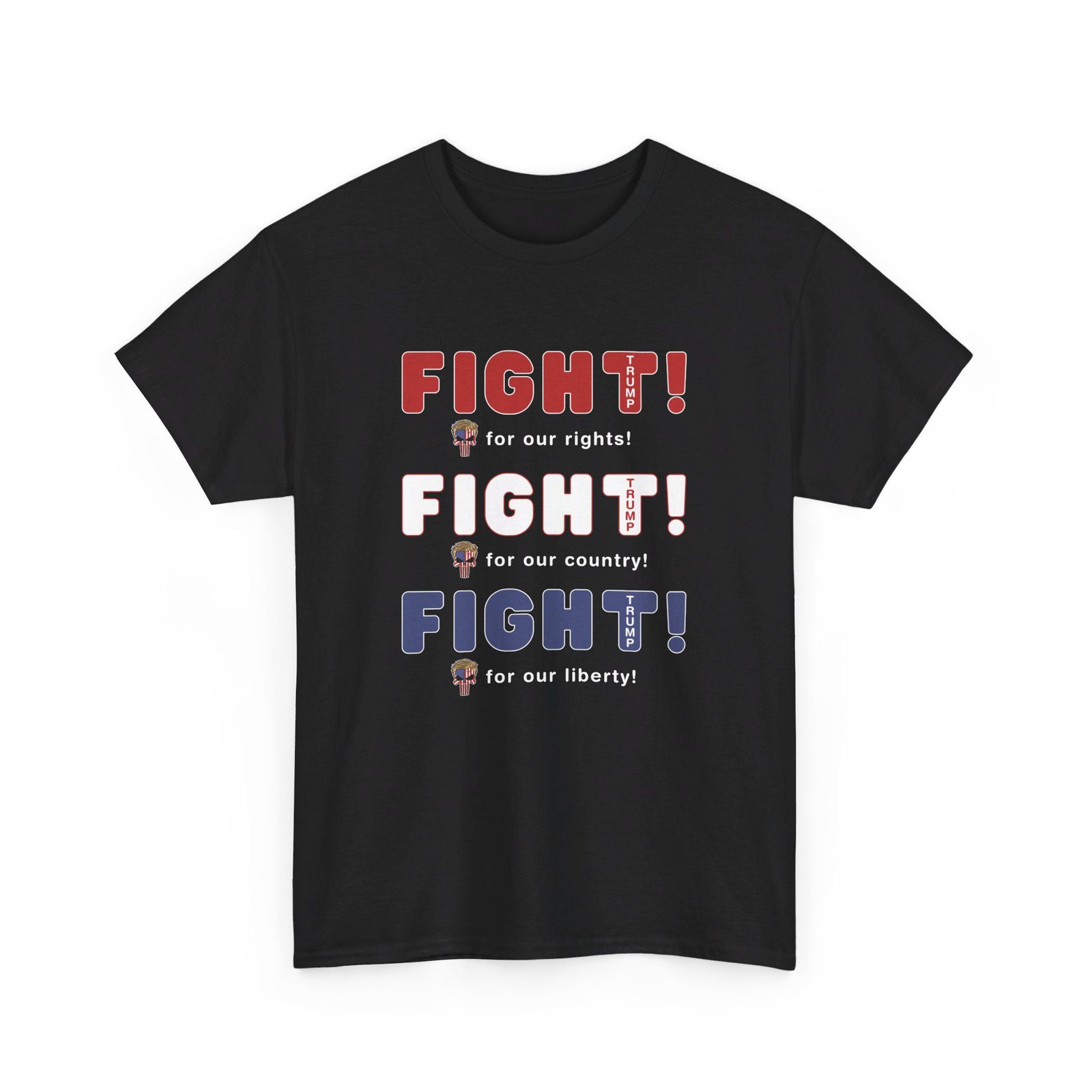 DESIGN: The text “FIGHT! FIGHT! FIGHT!” in red, white, and blue. “FIGHT for our rights, for our country, for our liberty”.An illustration of a skull embedded with the American Flag and with President Donald Trump’s iconic blonde hairstyle, times three. The text “TRUMP2024” in each letter “T”. Colors are white, black, gold, red, blue, etc. Your choice of t-shirt colors.