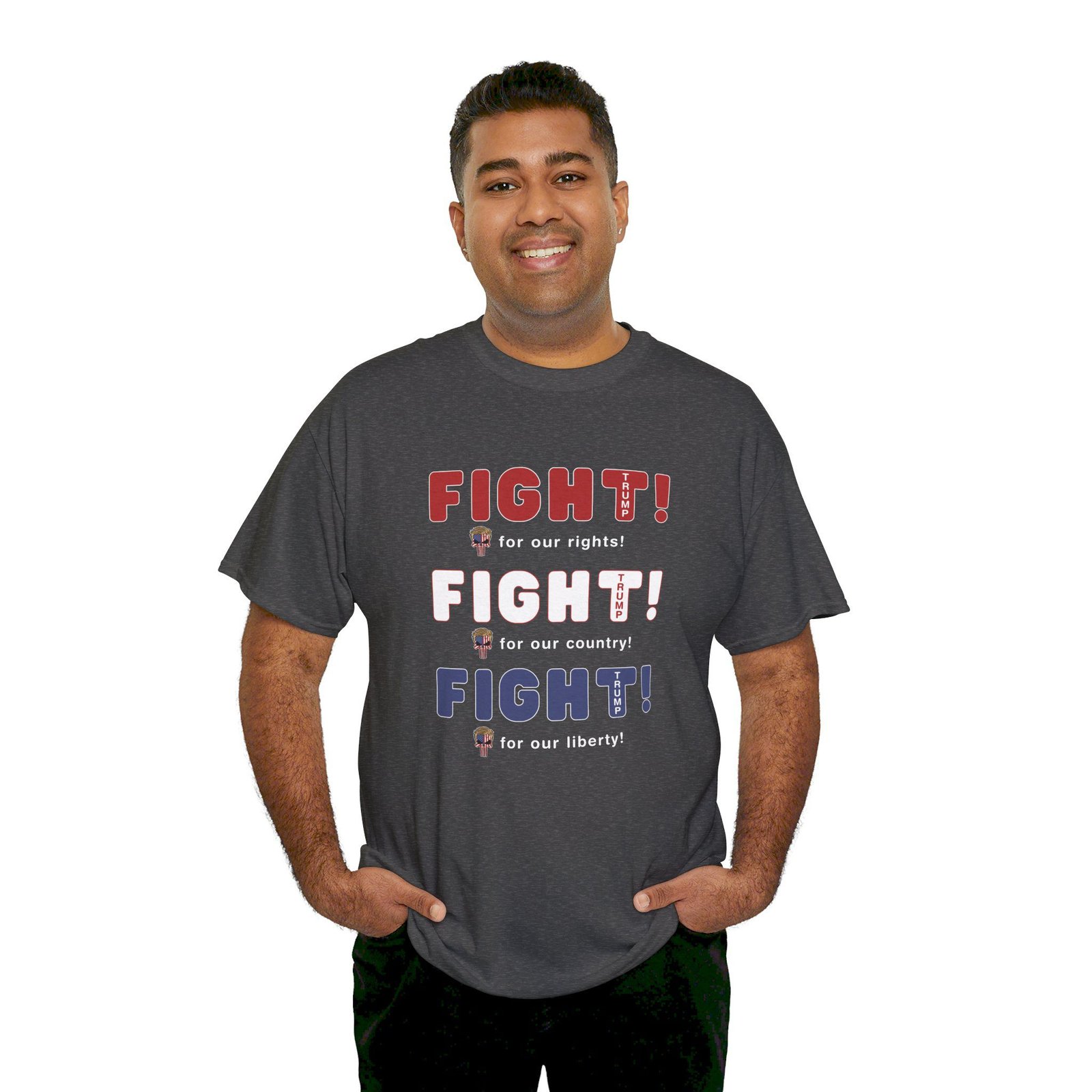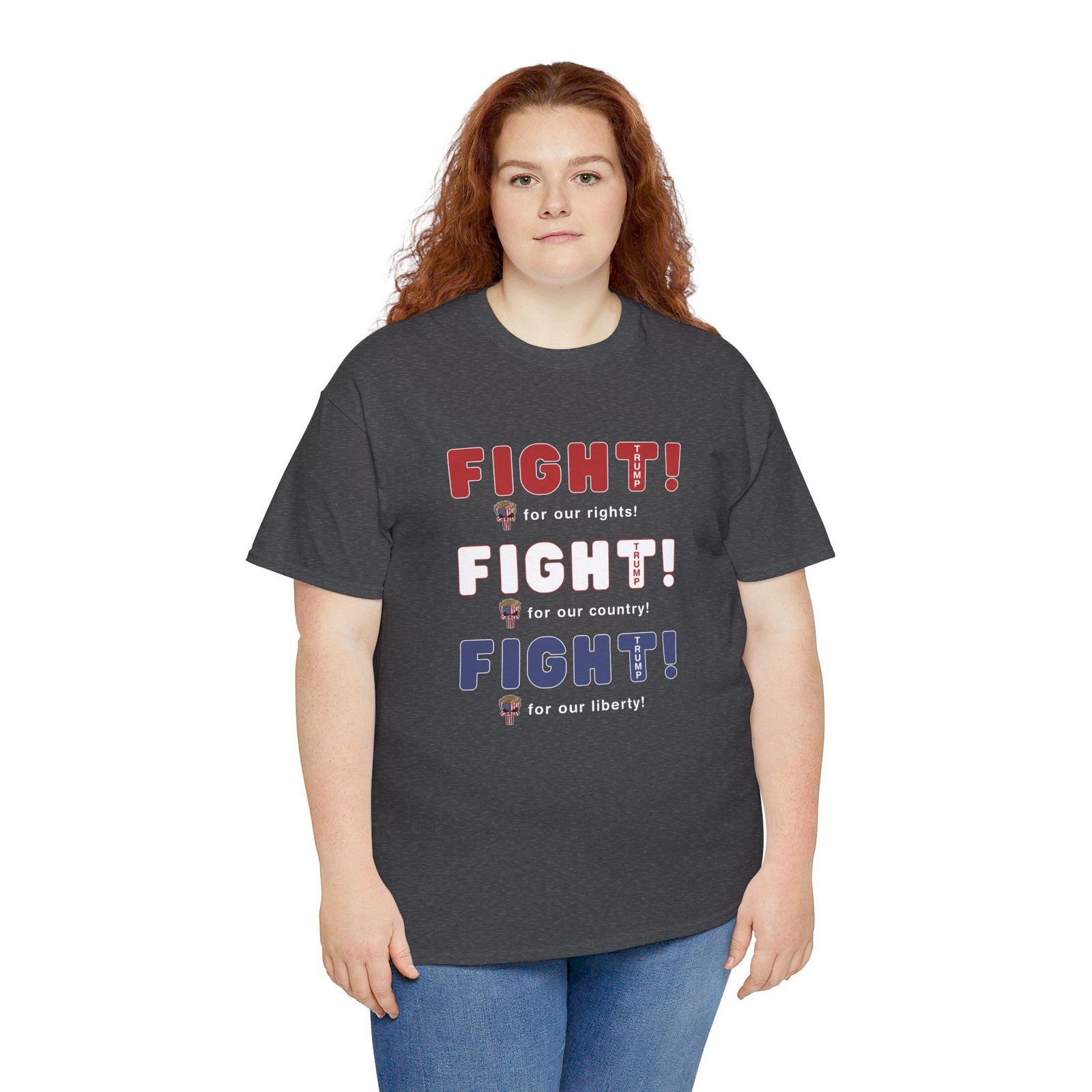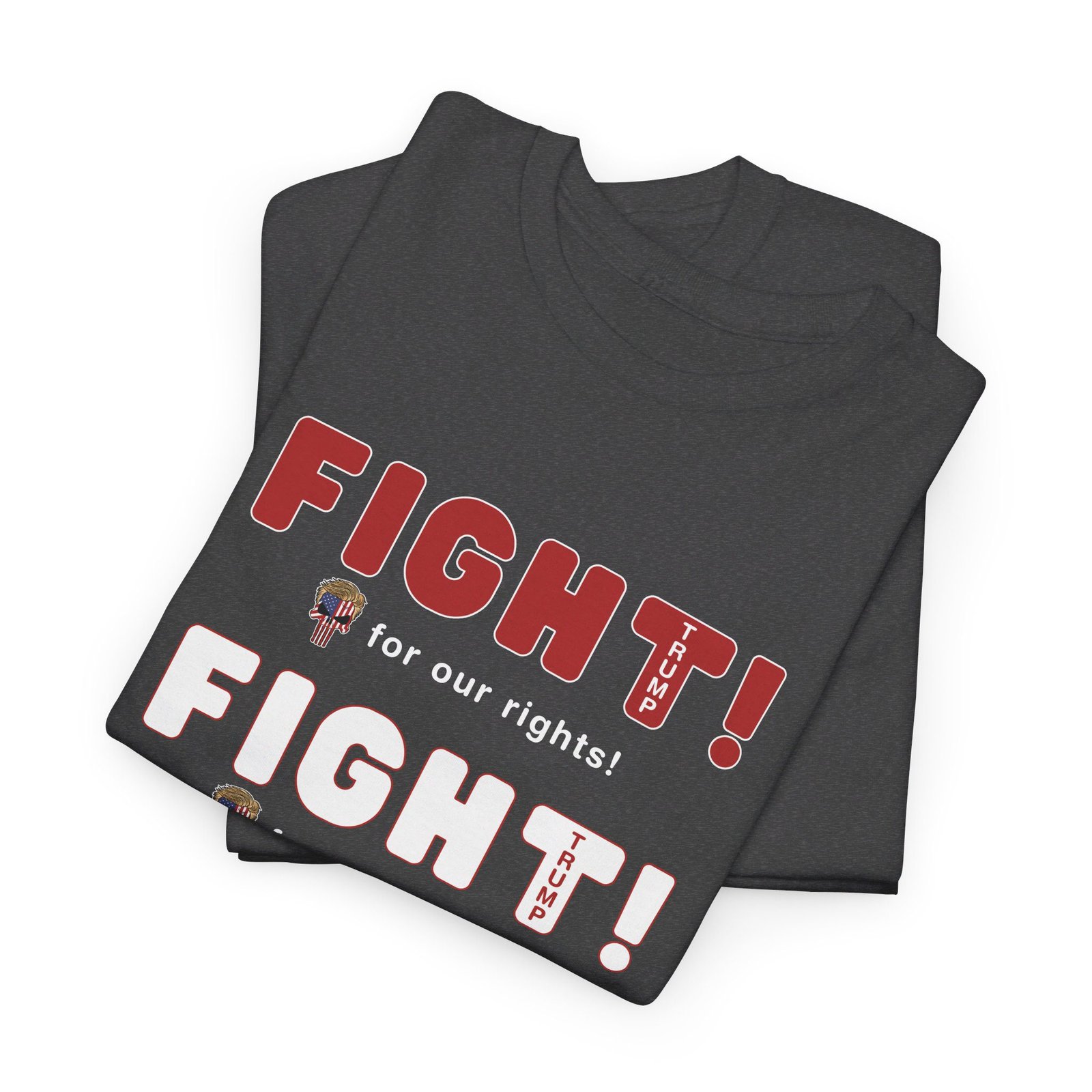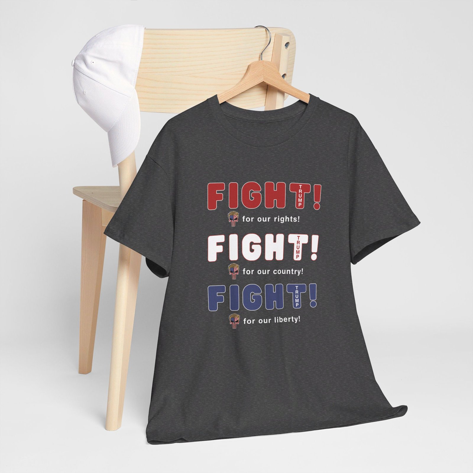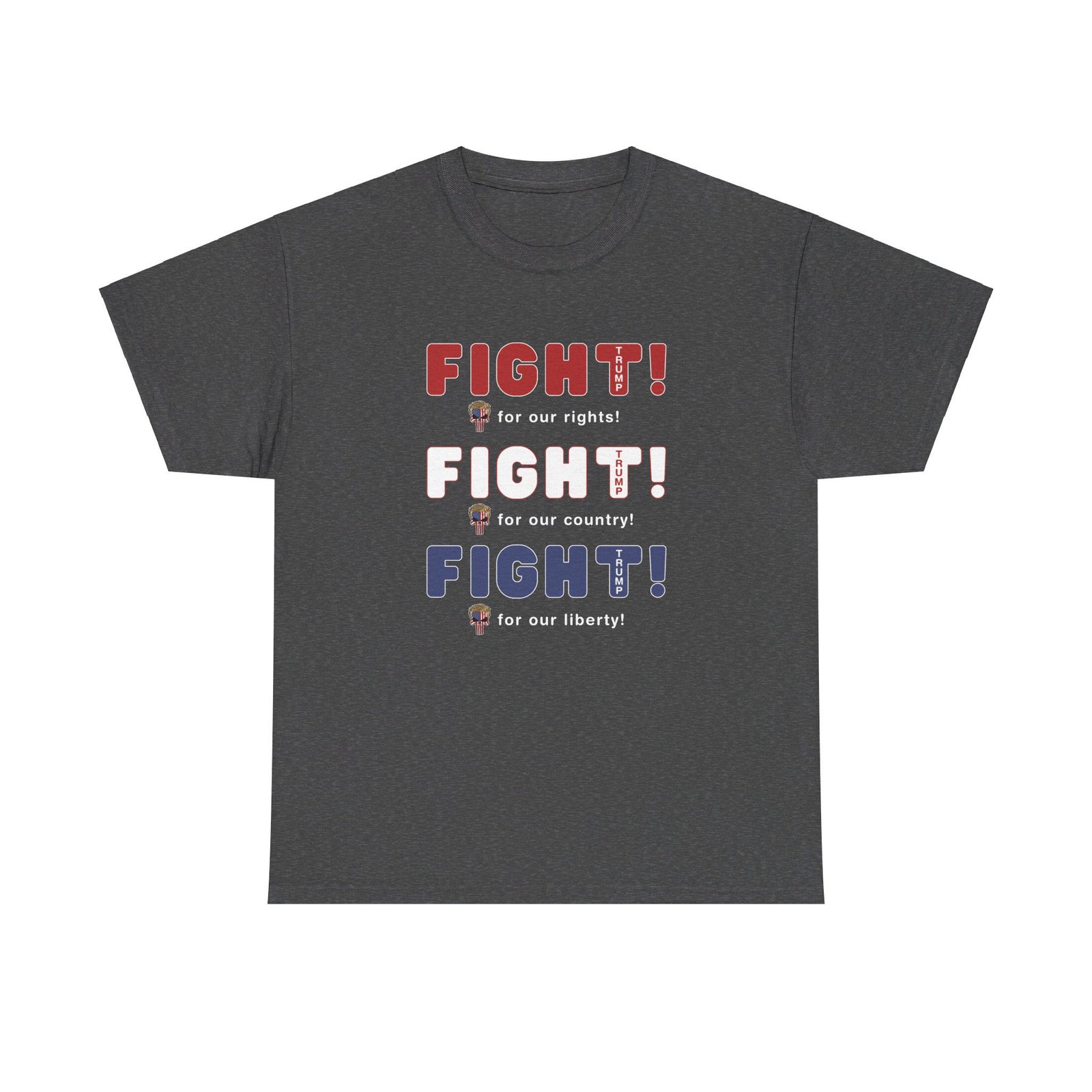 DESIGN: The text “FIGHT! FIGHT! FIGHT!” in red, white, and blue. “FIGHT for our rights, for our country, for our liberty”.An illustration of a skull embedded with the American Flag and with President Donald Trump’s iconic blonde hairstyle, times three. The text “TRUMP2024” in each letter “T”. Colors are white, black, gold, red, blue, etc. Your choice of t-shirt colors.