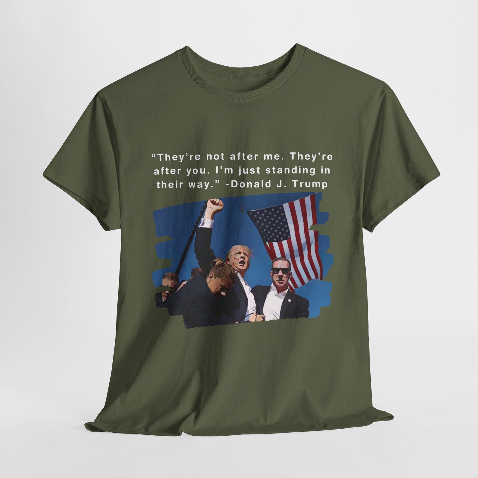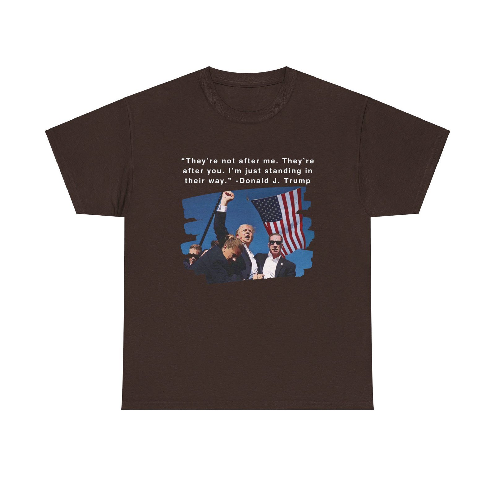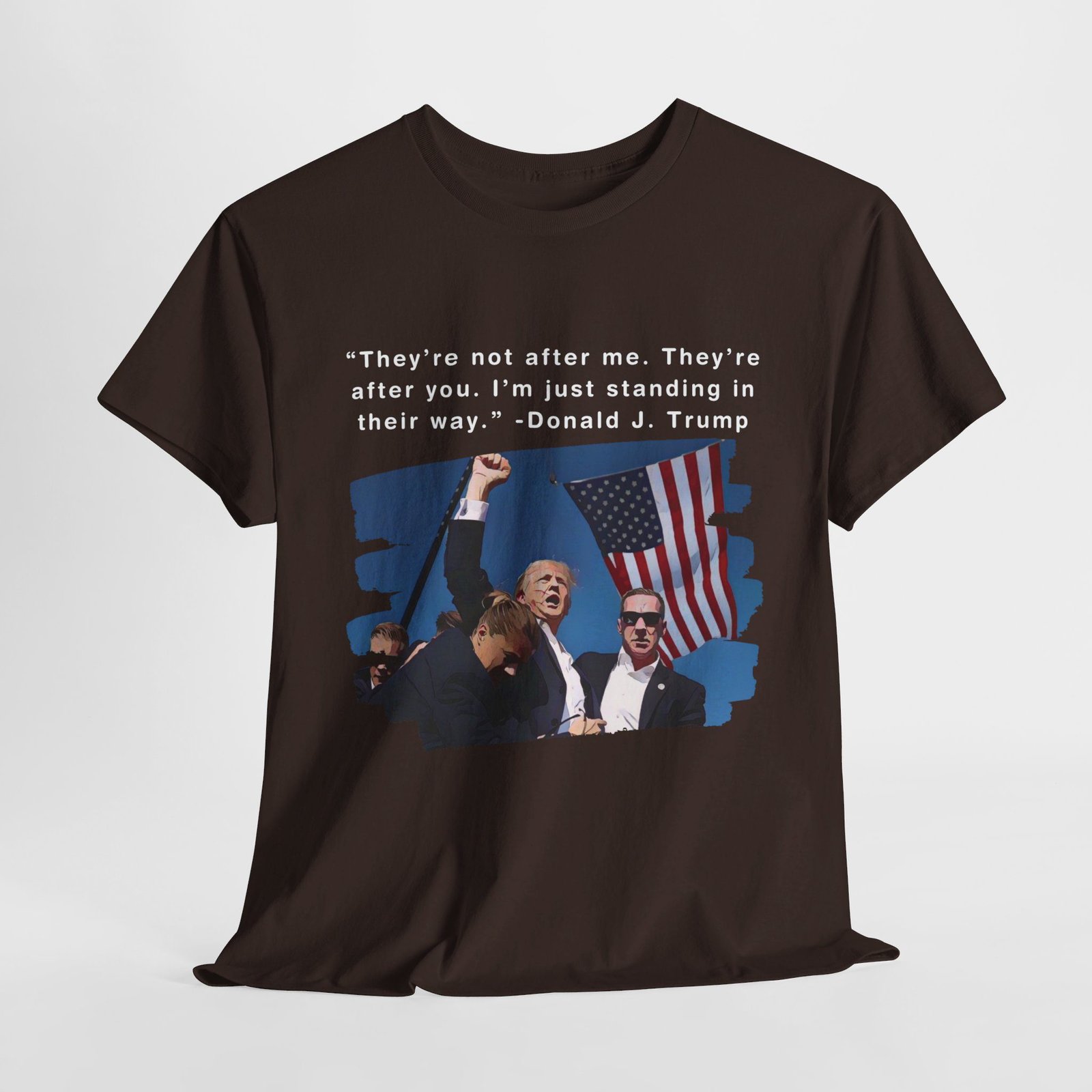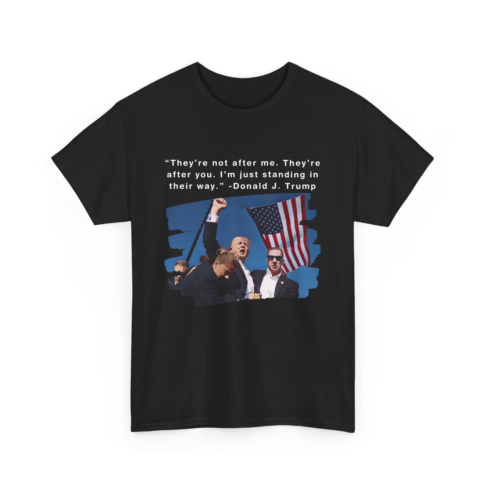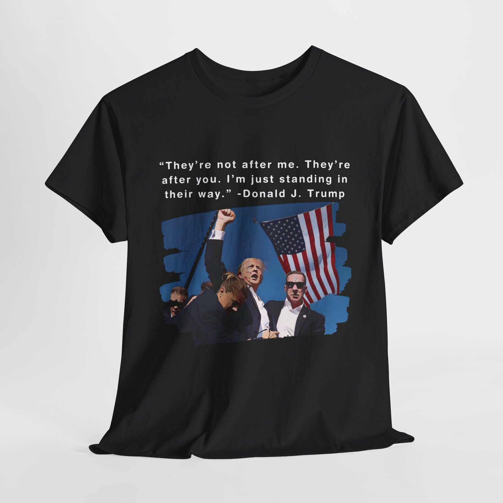 DESIGN: The text “They’re not after me, they’re after you. I’m just standing in their way. – Donald J. Trump”. An illustration of the image of President Trump after he was shot, fist pumping and saying FIGHT with a quote of what he has said many times! The image colors are blue, black, red, white, brown, etc.