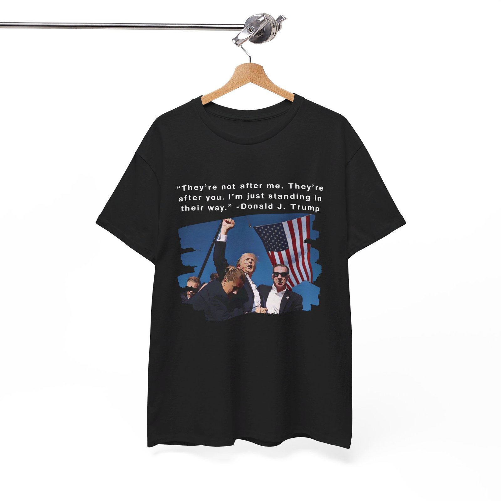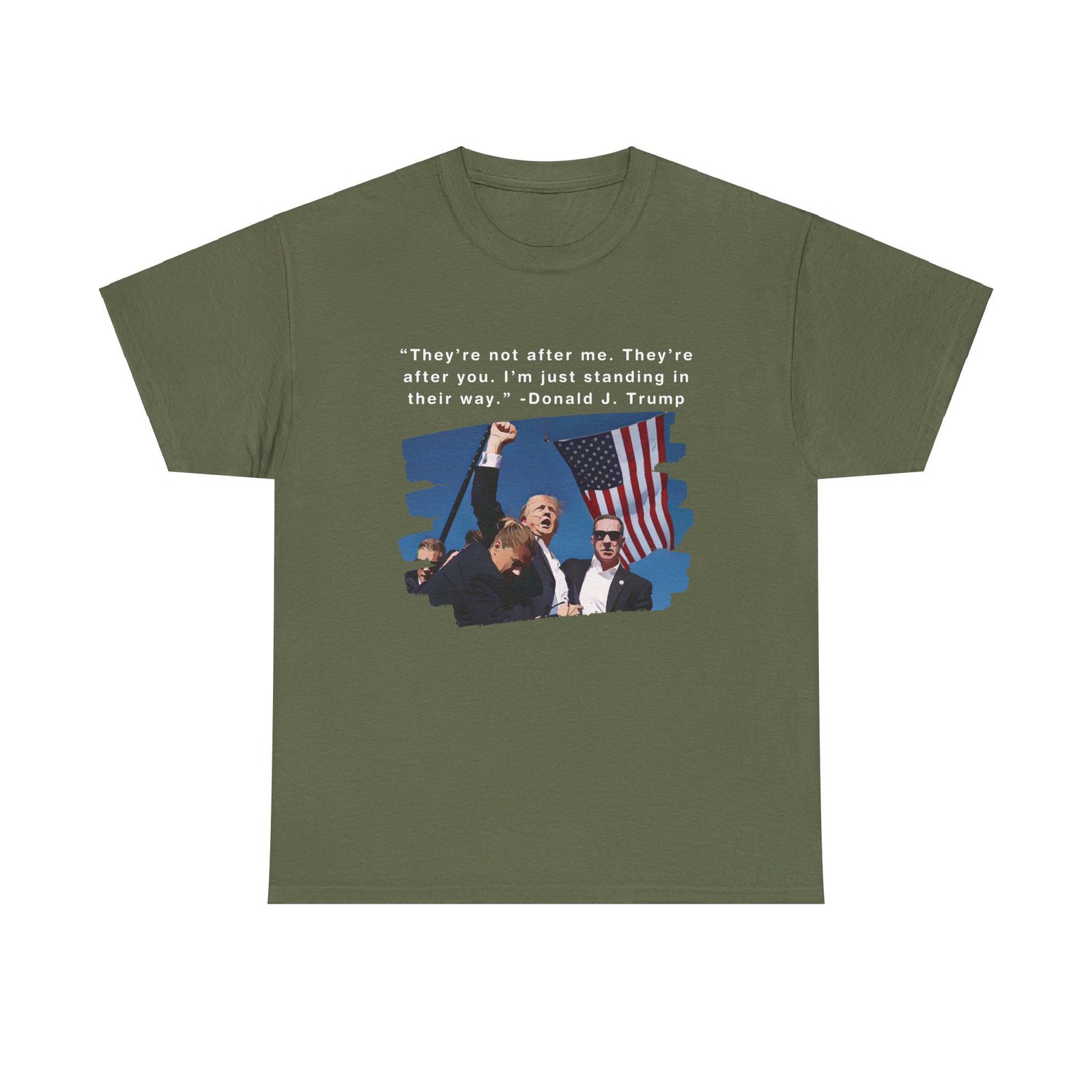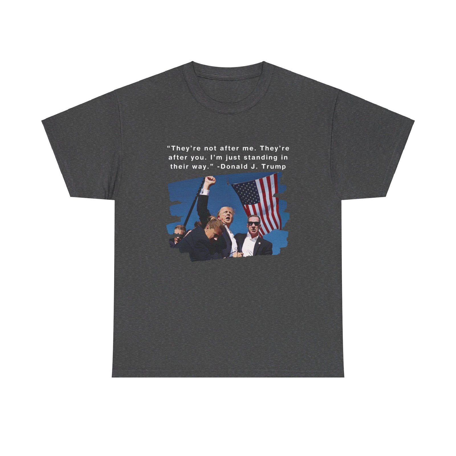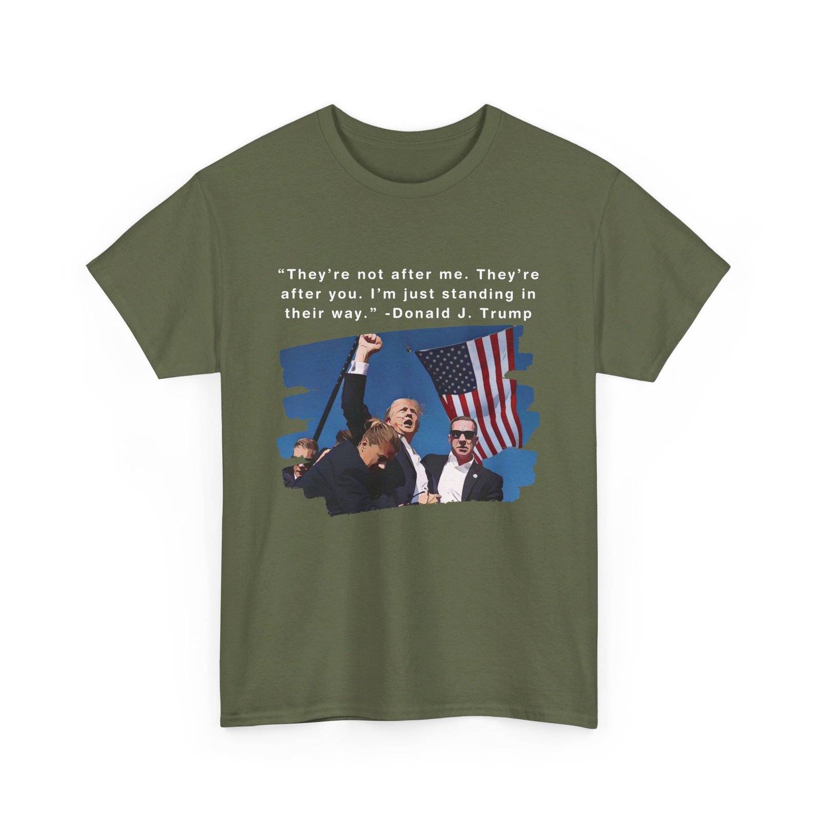 DESIGN: The text “They’re not after me, they’re after you. I’m just standing in their way. – Donald J. Trump”. An illustration of the image of President Trump after he was shot, fist pumping and saying FIGHT with a quote of what he has said many times! The image colors are blue, black, red, white, brown, etc.