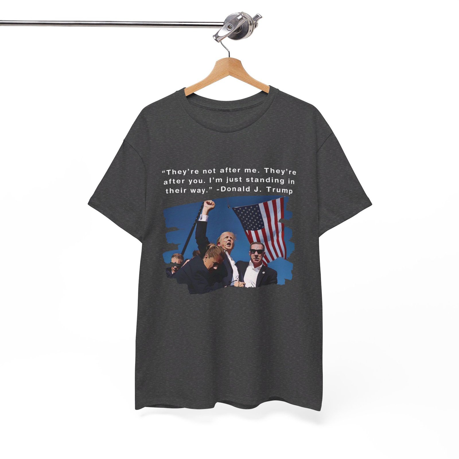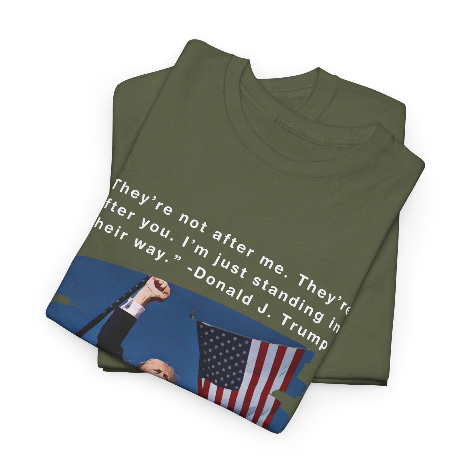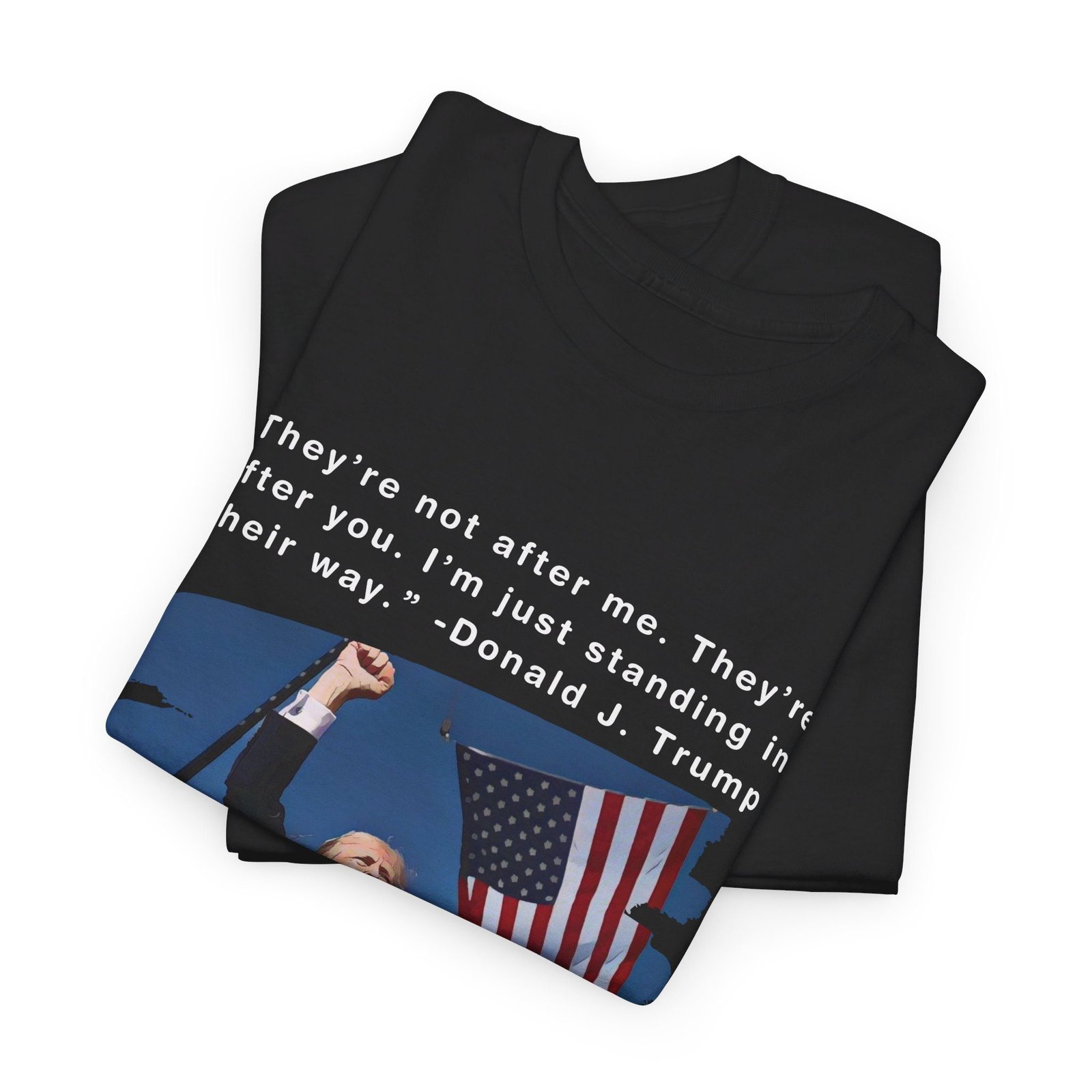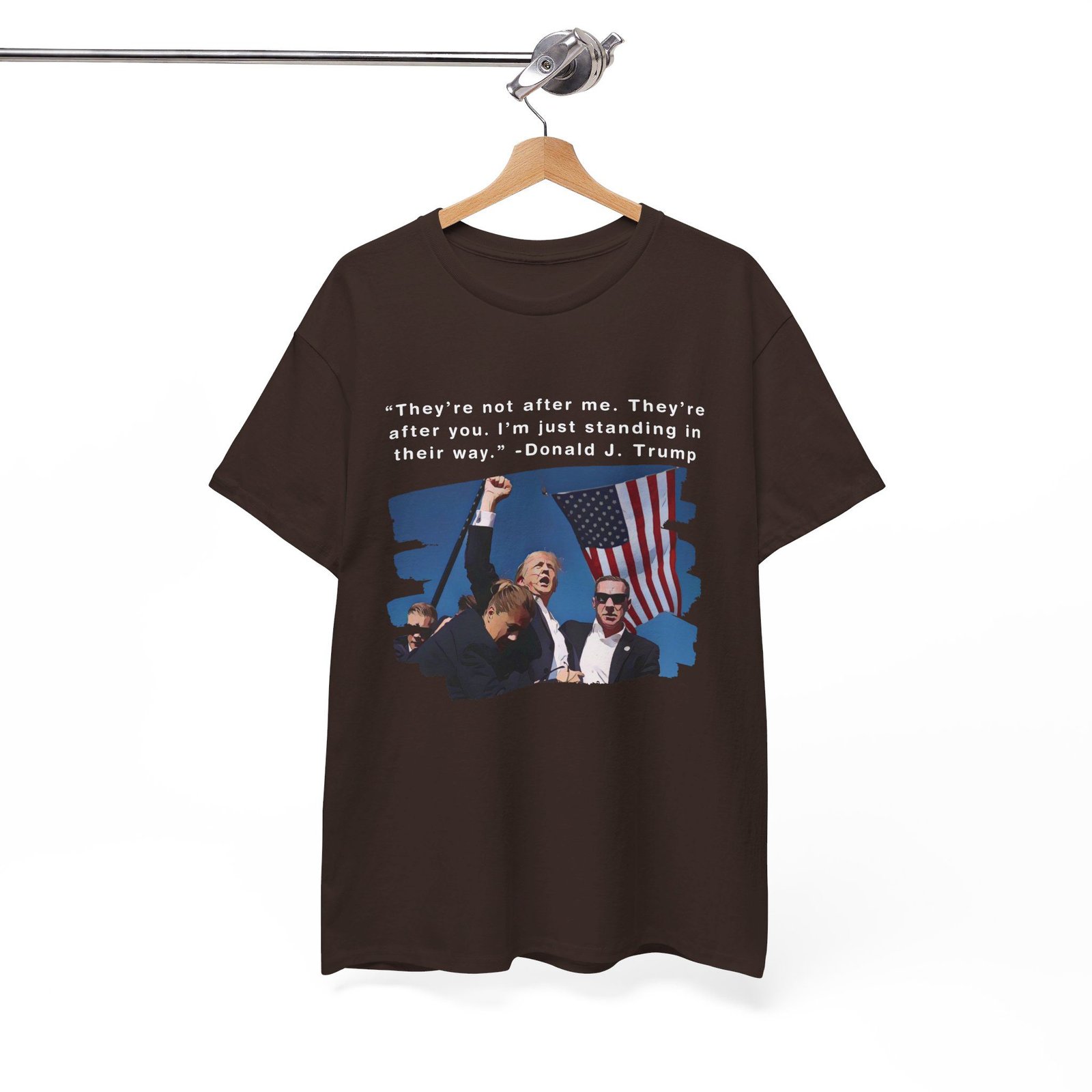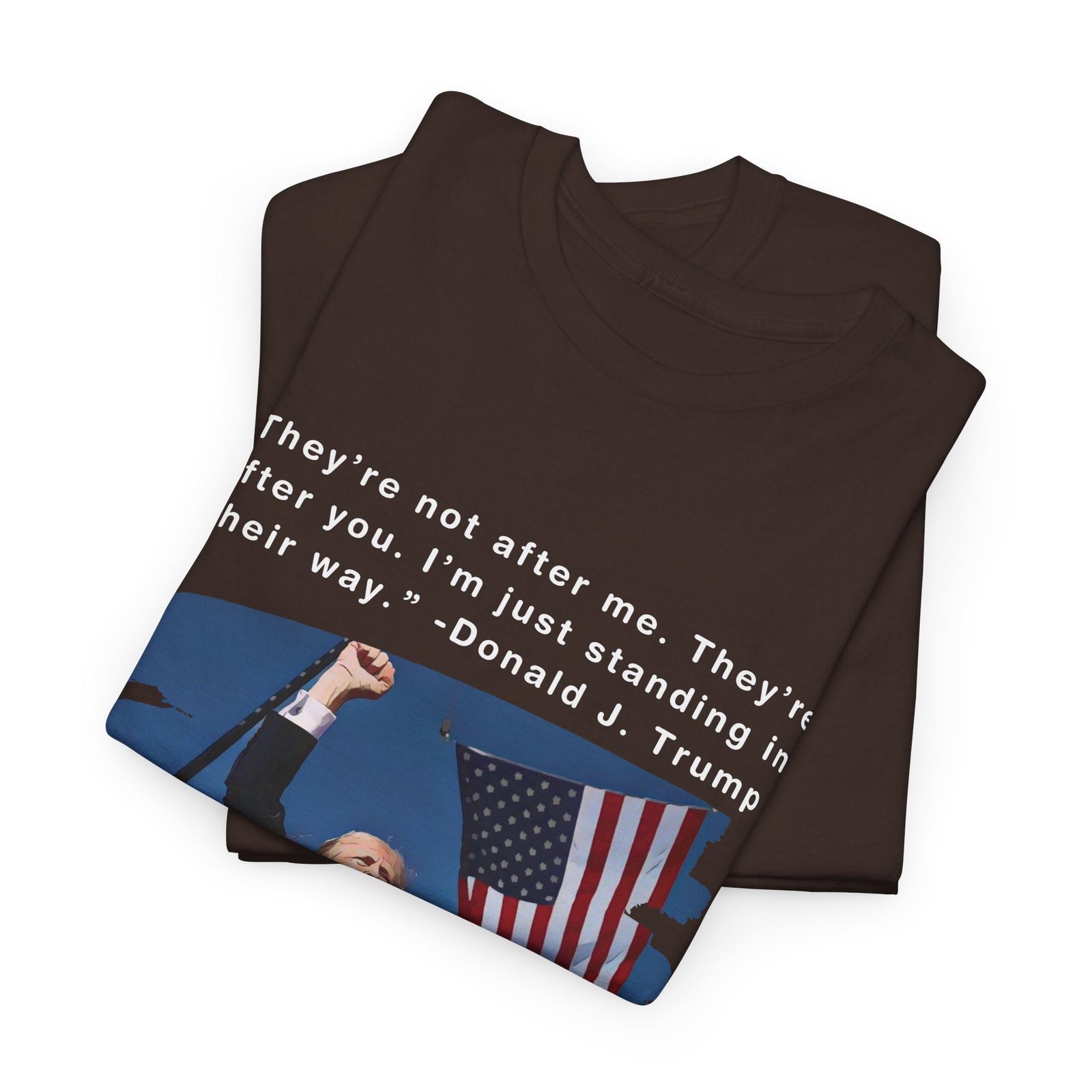 DESIGN: The text “They’re not after me, they’re after you. I’m just standing in their way. – Donald J. Trump”. An illustration of the image of President Trump after he was shot, fist pumping and saying FIGHT with a quote of what he has said many times! The image colors are blue, black, red, white, brown, etc.