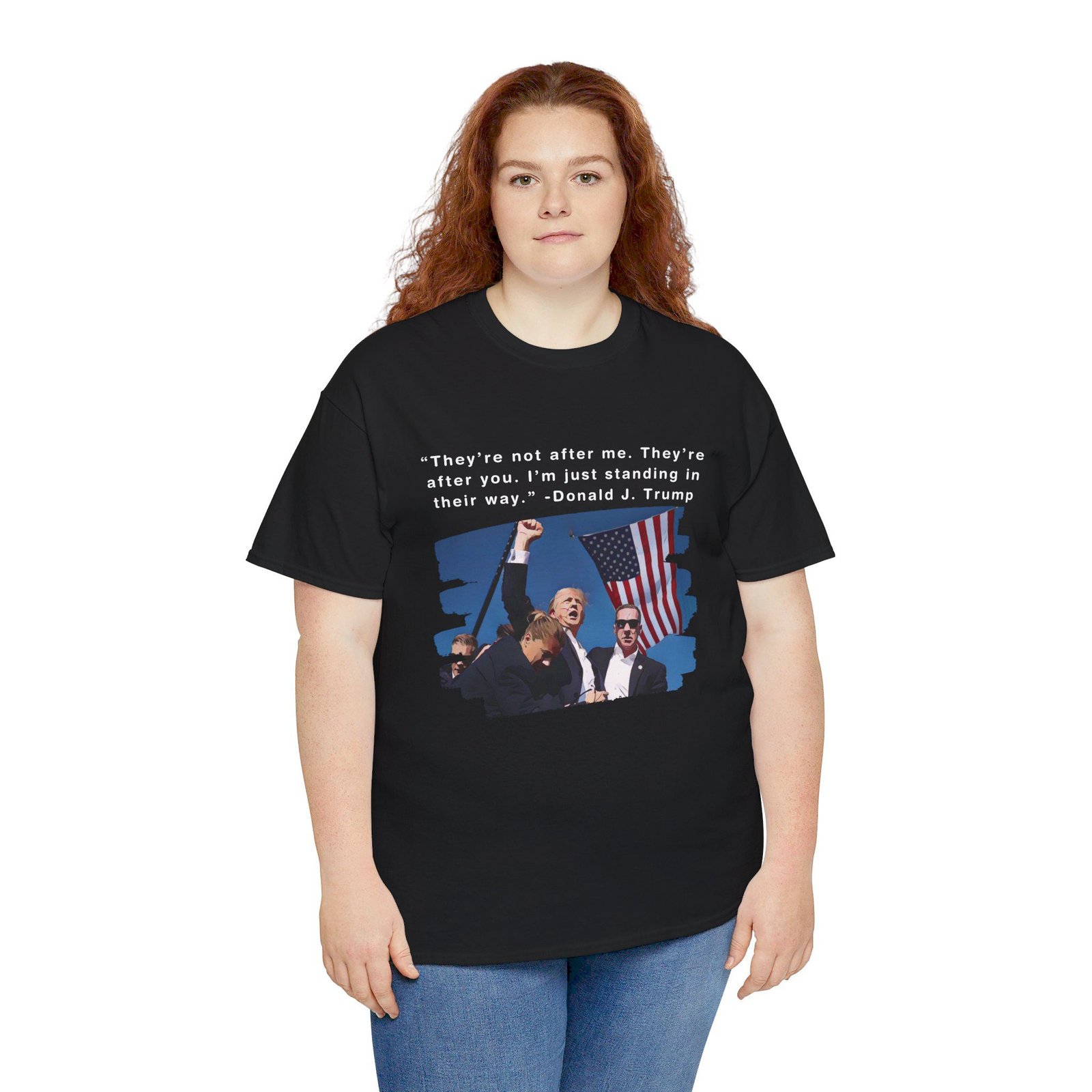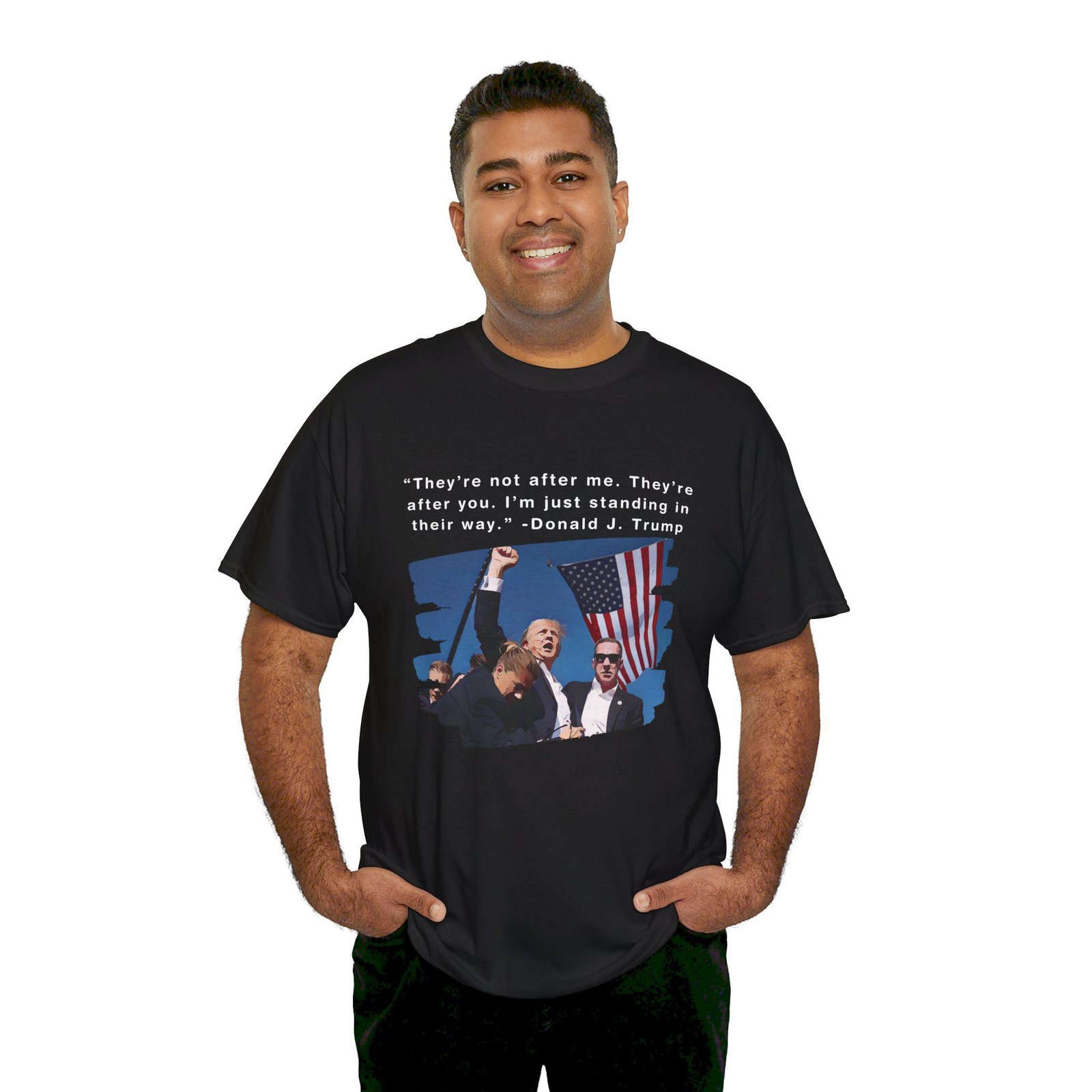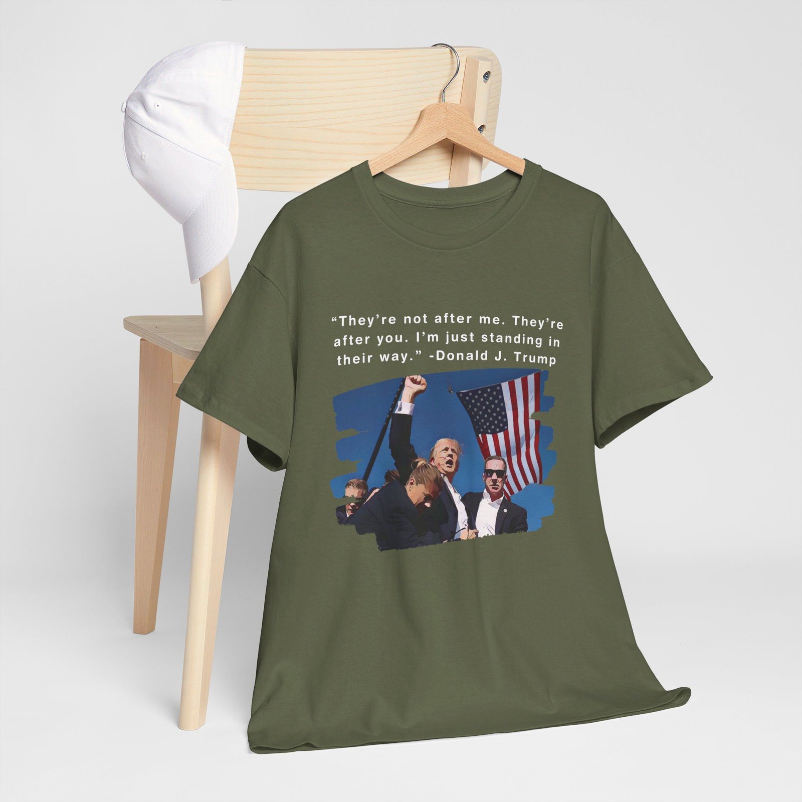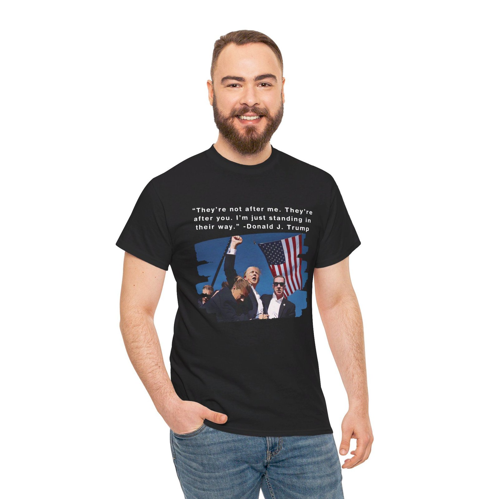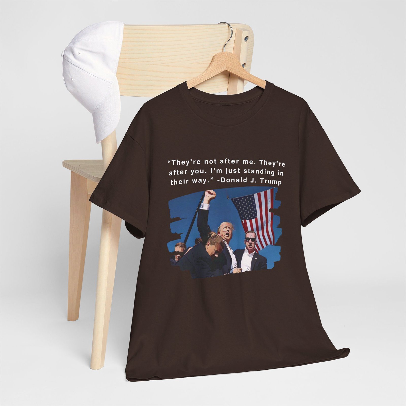 DESIGN: The text “They’re not after me, they’re after you. I’m just standing in their way. – Donald J. Trump”. An illustration of the image of President Trump after he was shot, fist pumping and saying FIGHT with a quote of what he has said many times! The image colors are blue, black, red, white, brown, etc.