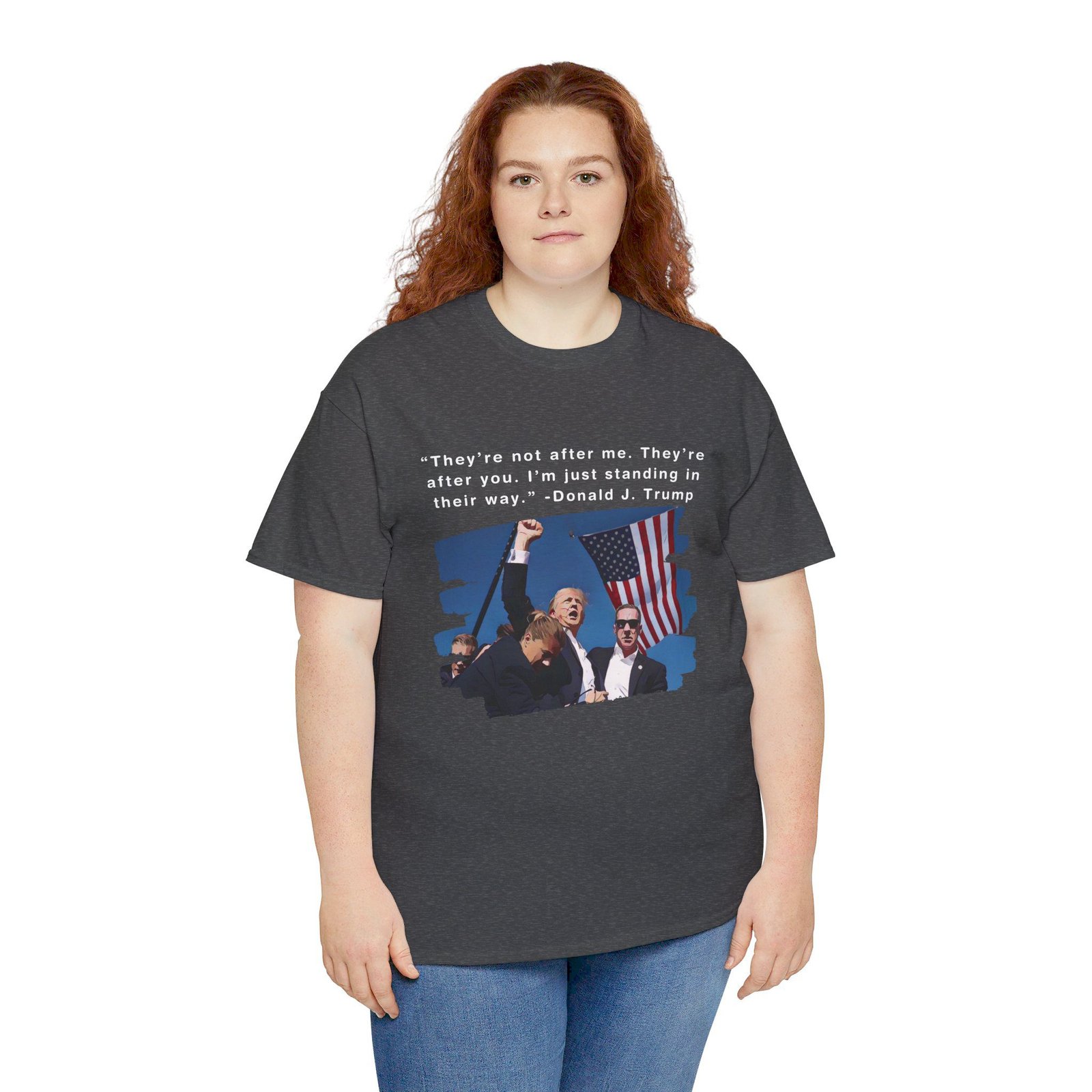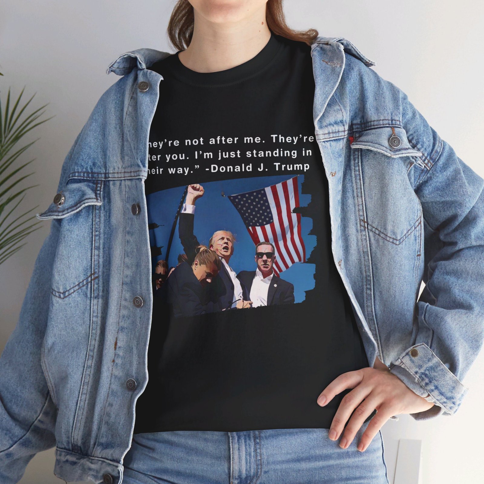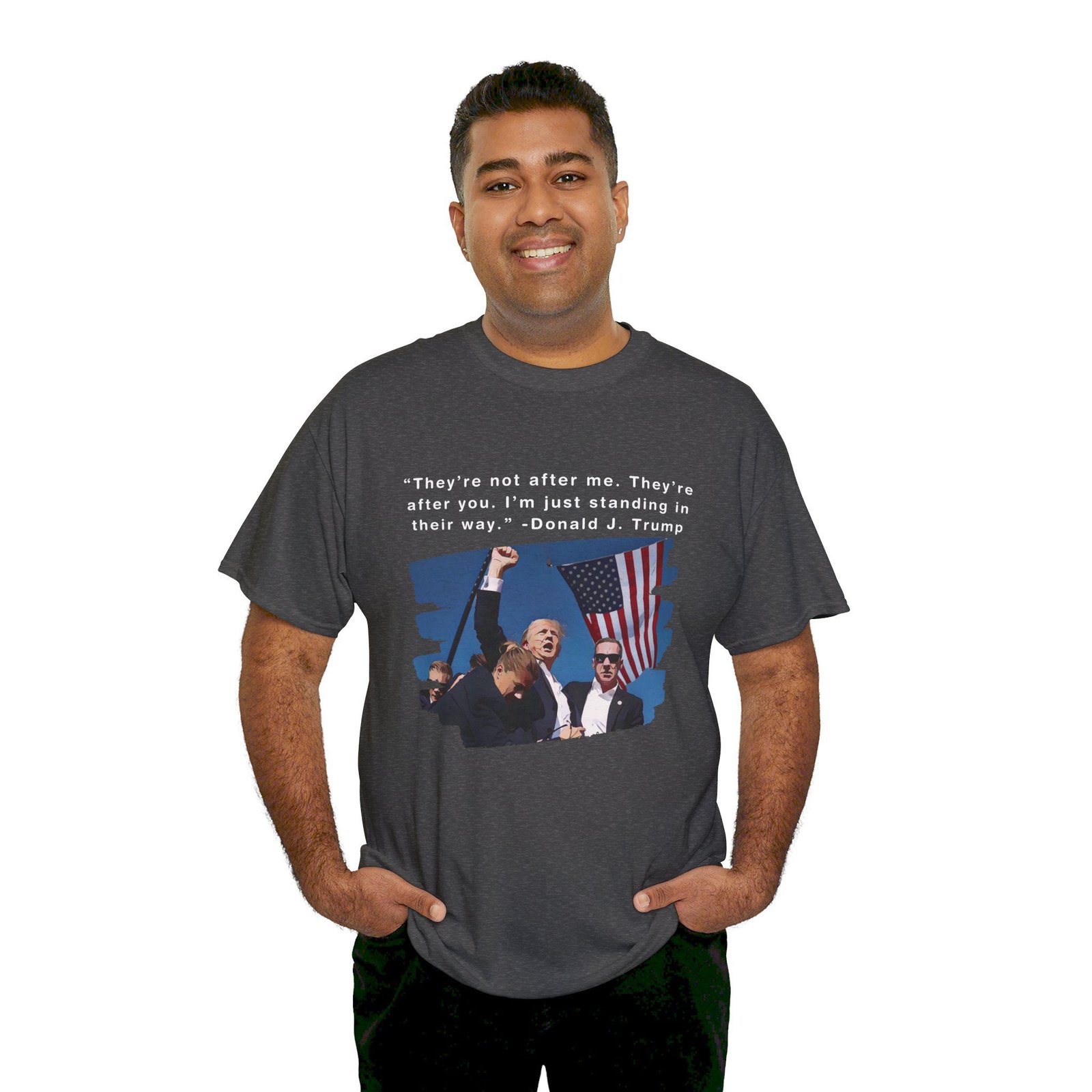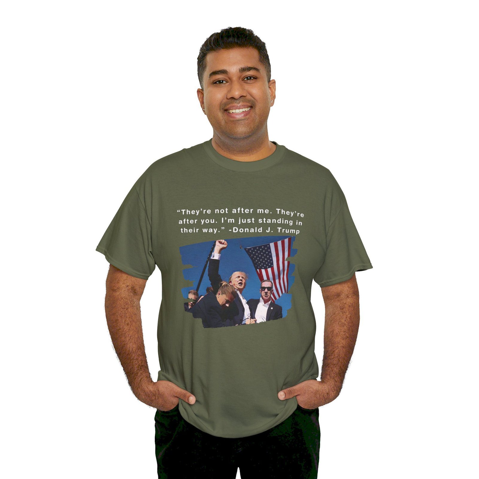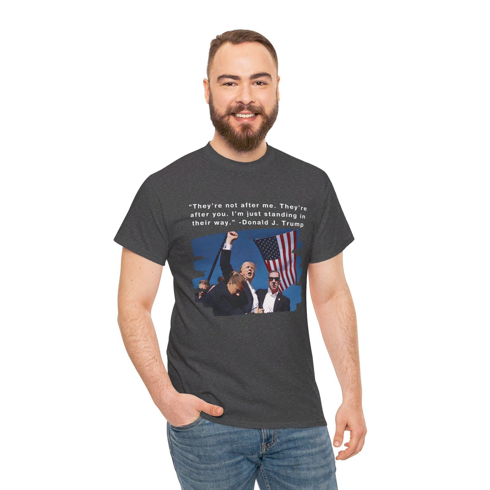 DESIGN: The text “They’re not after me, they’re after you. I’m just standing in their way. – Donald J. Trump”. An illustration of the image of President Trump after he was shot, fist pumping and saying FIGHT with a quote of what he has said many times! The image colors are blue, black, red, white, brown, etc.