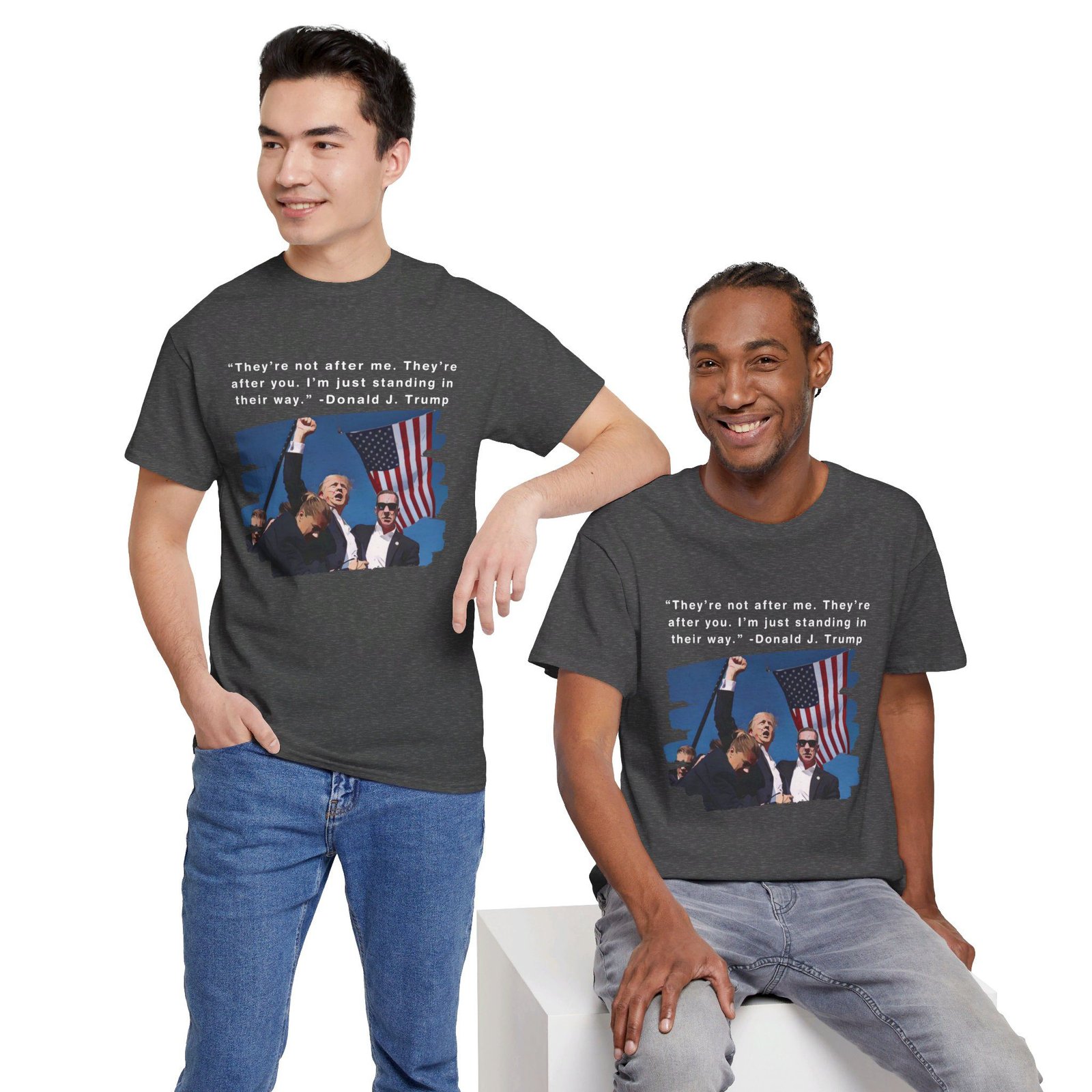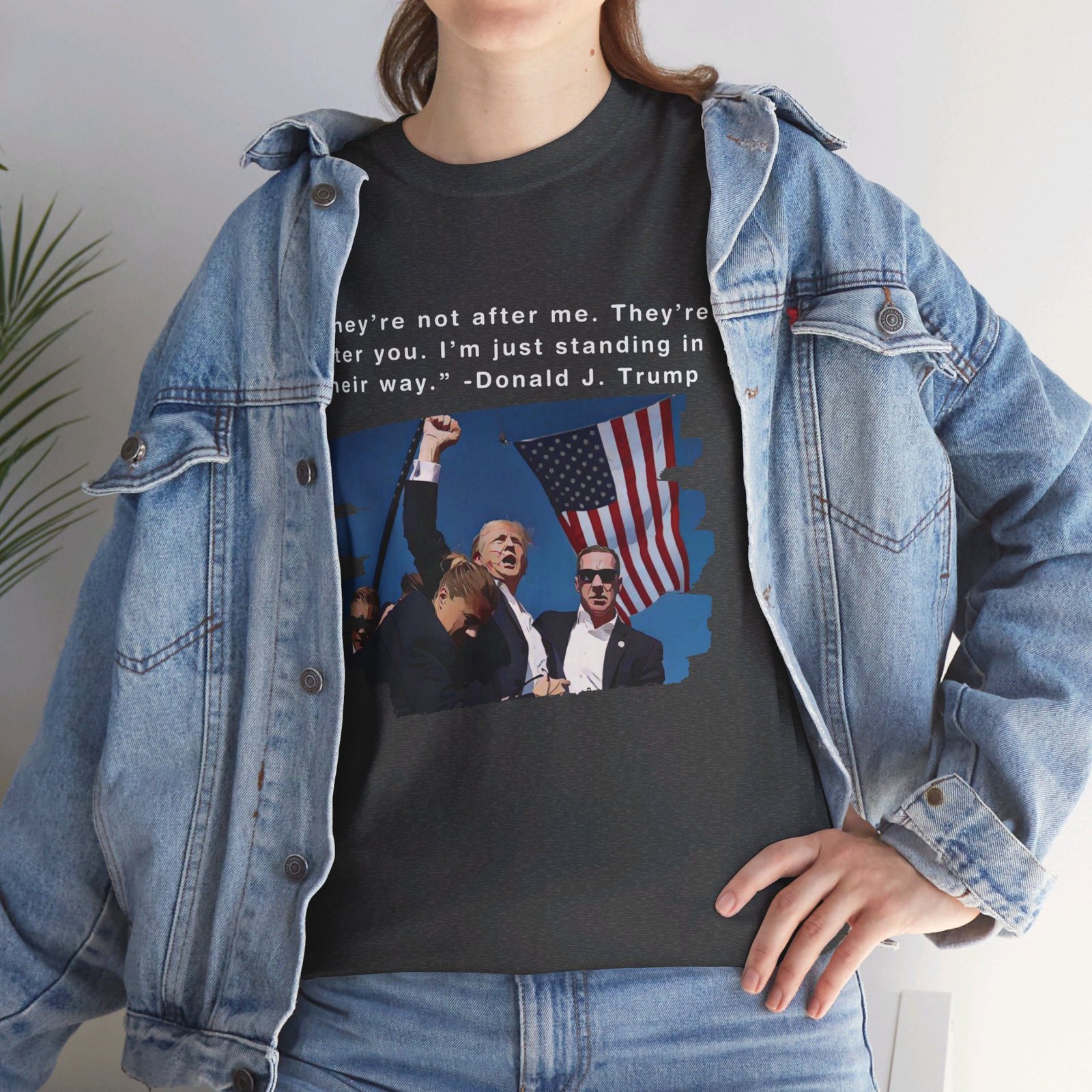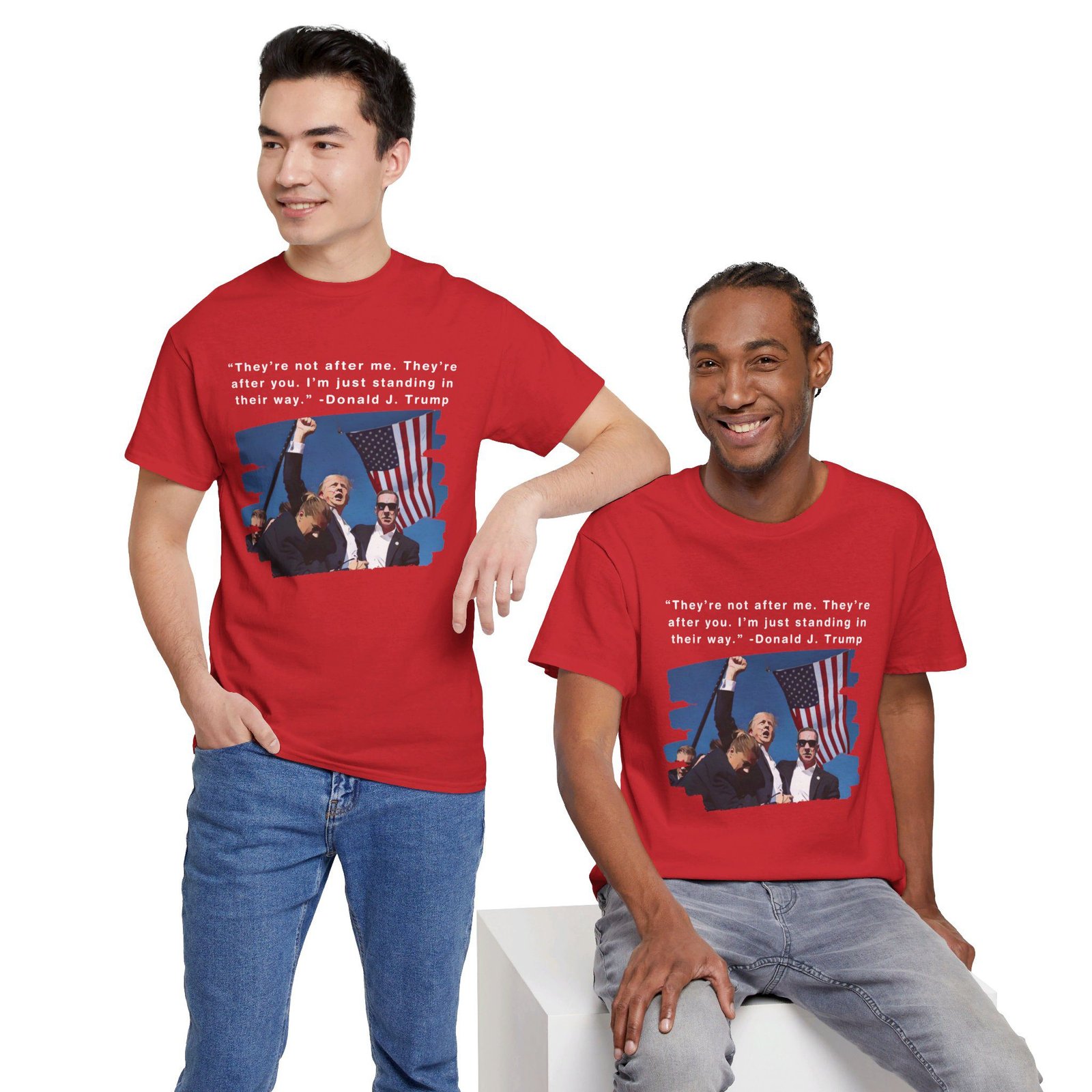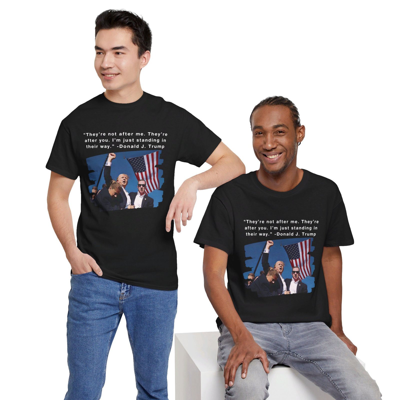 DESIGN: The text “They’re not after me, they’re after you. I’m just standing in their way. – Donald J. Trump”. An illustration of the image of President Trump after he was shot, fist pumping and saying FIGHT with a quote of what he has said many times! The image colors are blue, black, red, white, brown, etc.