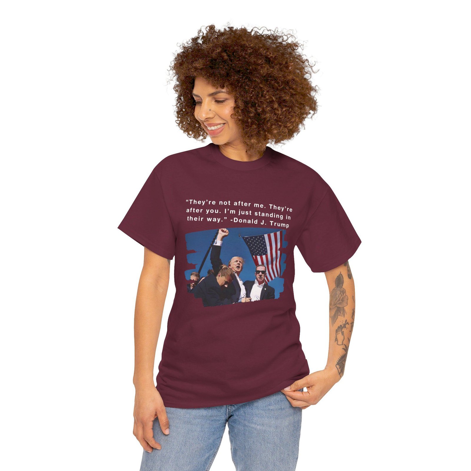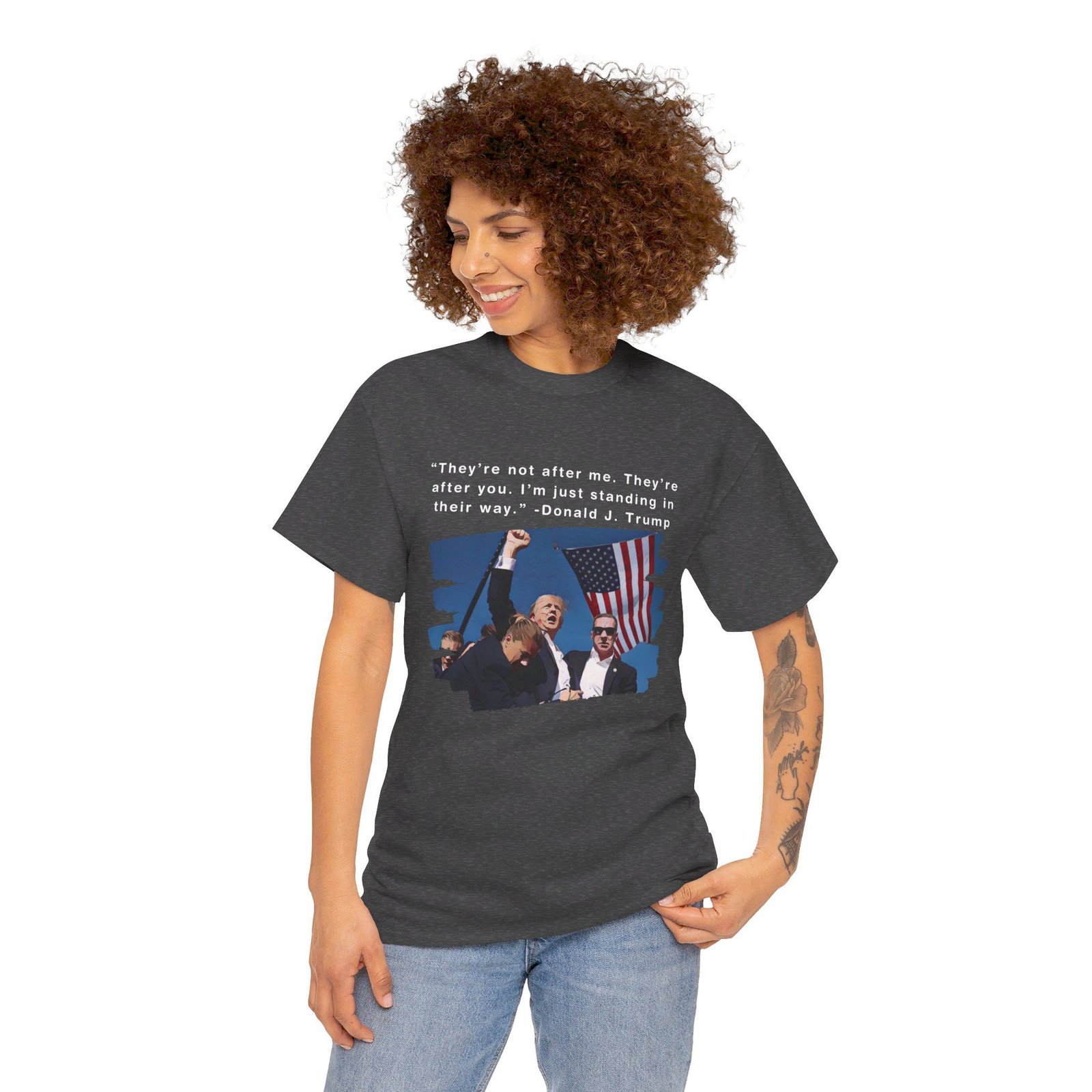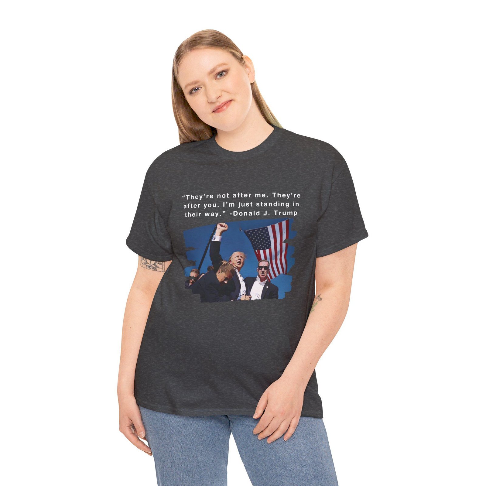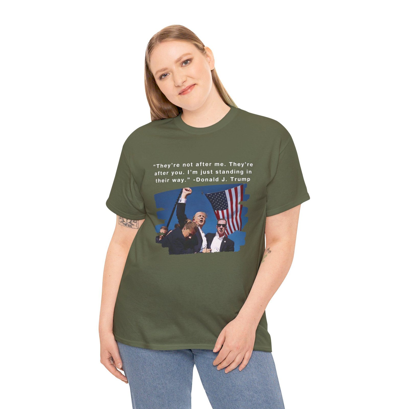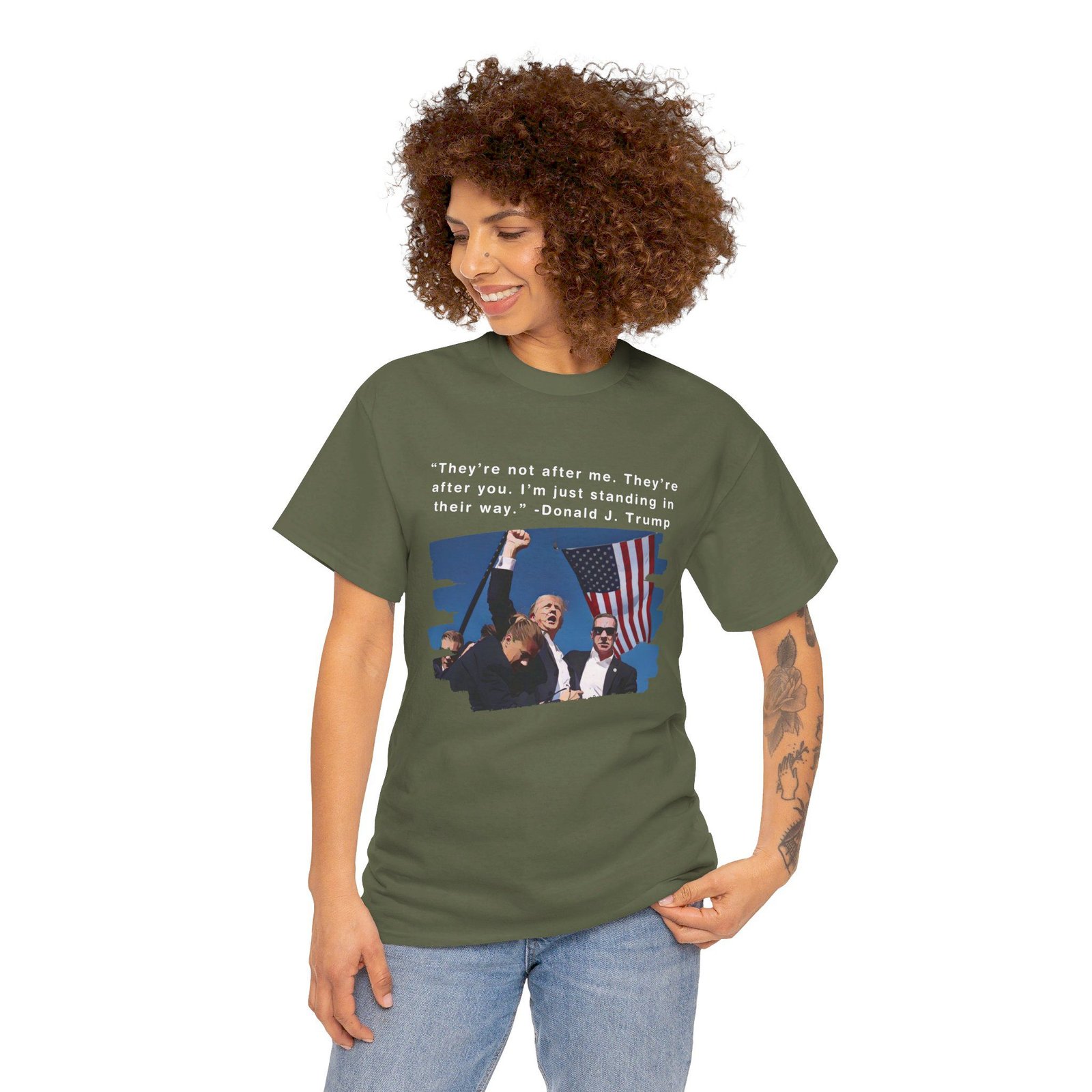 DESIGN: The text “They’re not after me, they’re after you. I’m just standing in their way. – Donald J. Trump”. An illustration of the image of President Trump after he was shot, fist pumping and saying FIGHT with a quote of what he has said many times! The image colors are blue, black, red, white, brown, etc.