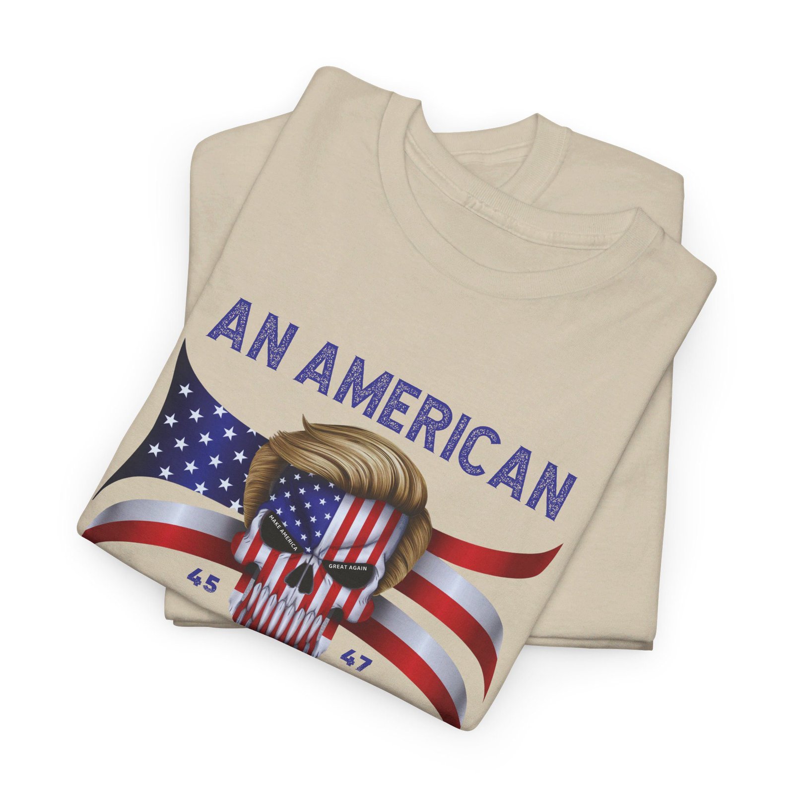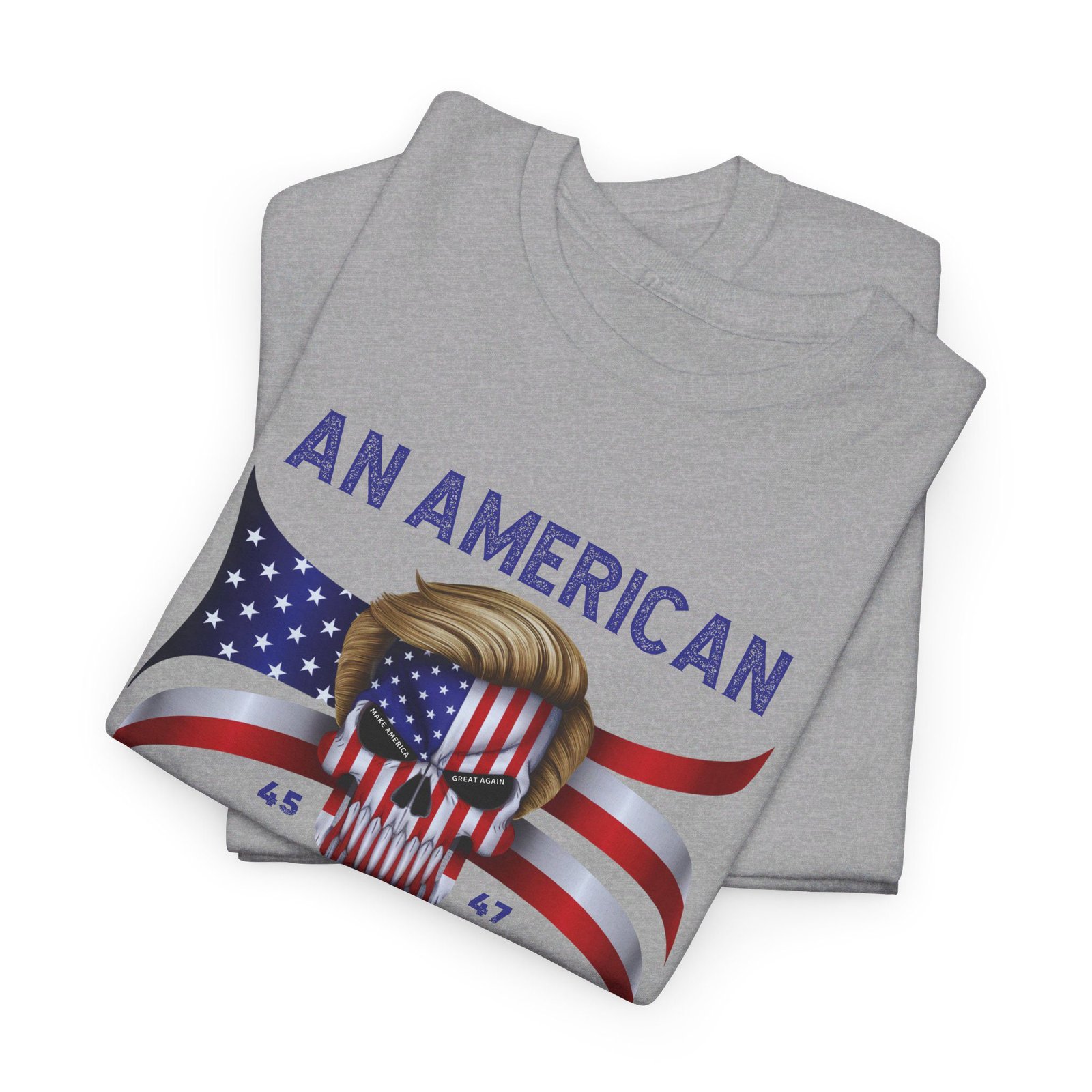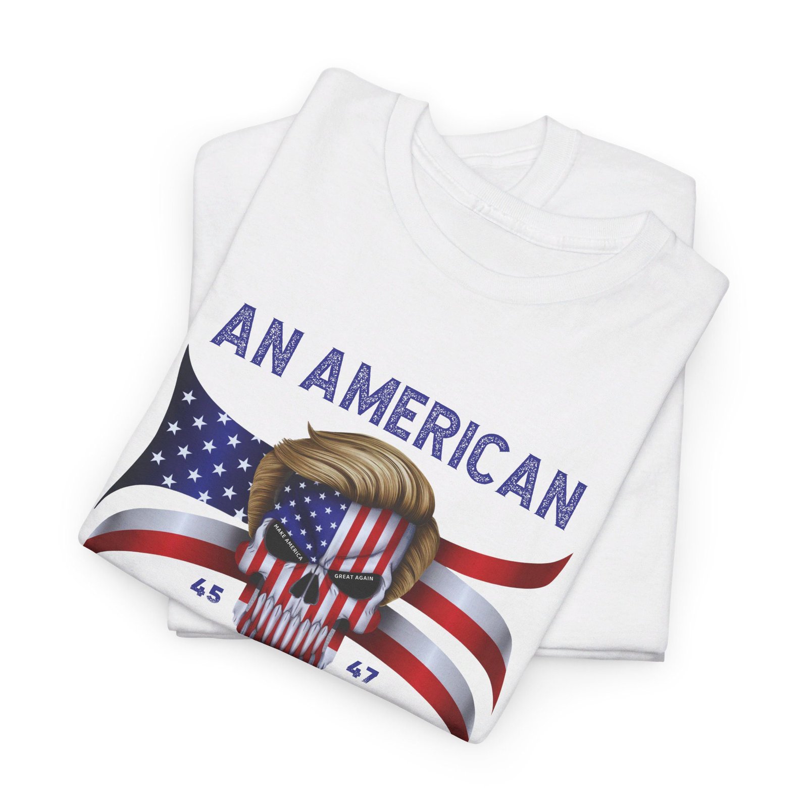 DESIGN: The text “AN AMERICAN BADASS” plus “TRUMP 2024” plus “MAKE AMERICA GREAT AGAIN”. An illustration of a badass skeleton we embedded with the American flag plus a stylized American flag behind him. The skull has President Donald J. Trump’s iconic blonde hairstyle. Colors are red, white, blue, golden yellow, and black. Your choice of t-shirt color.