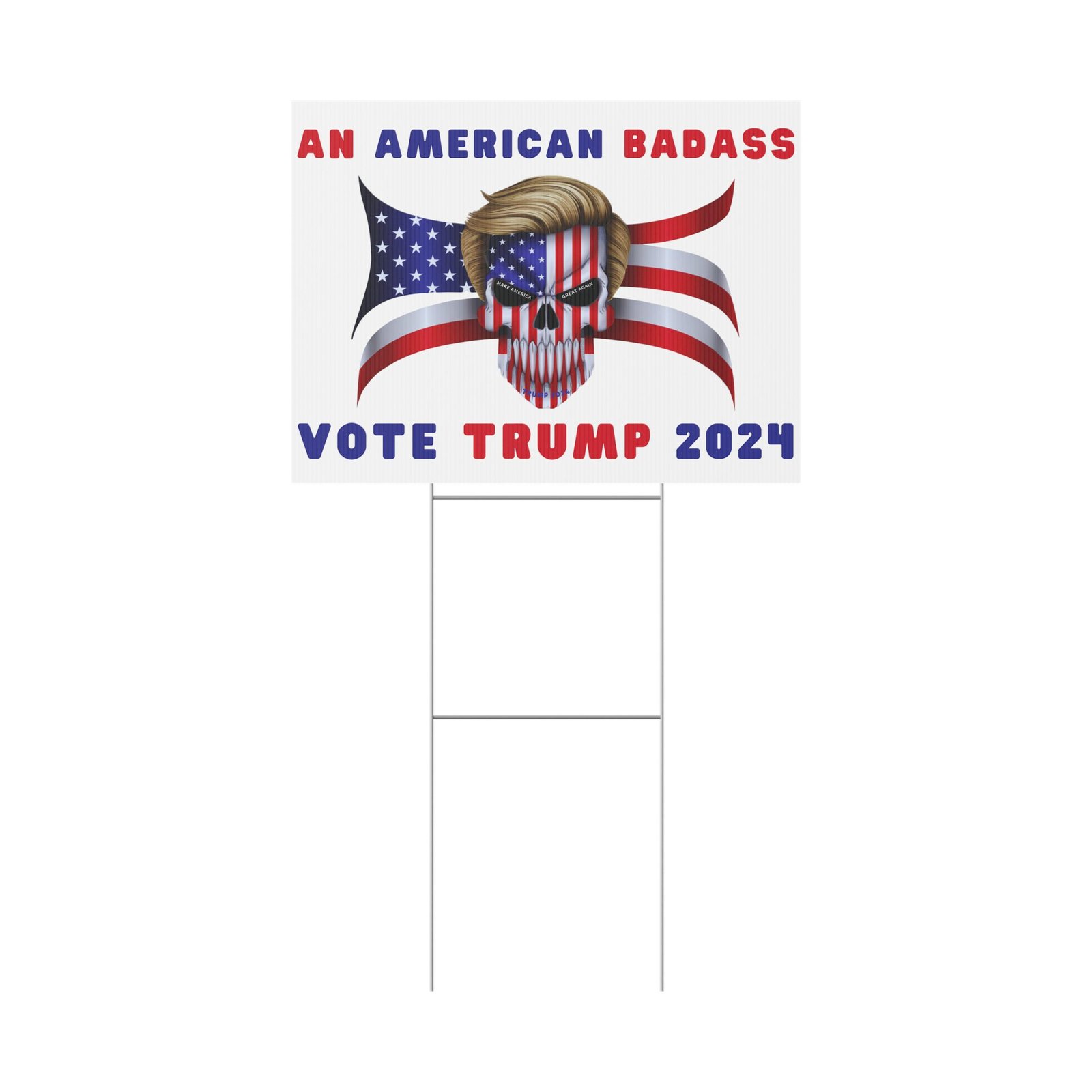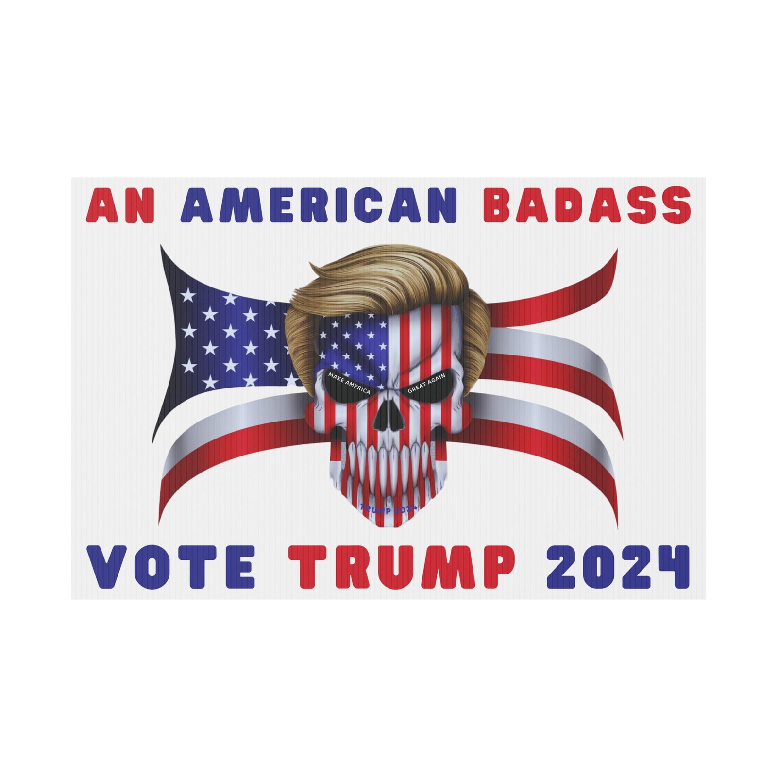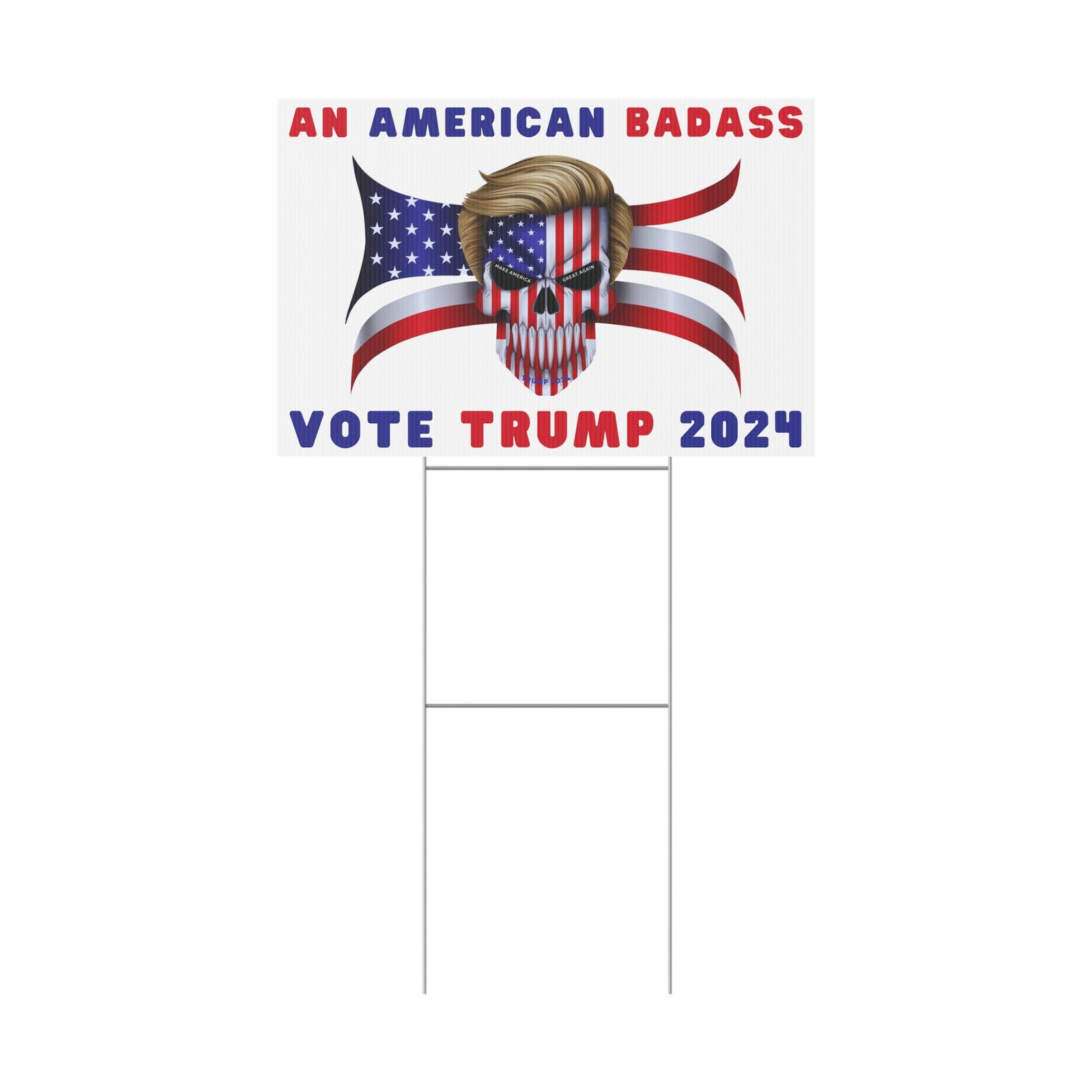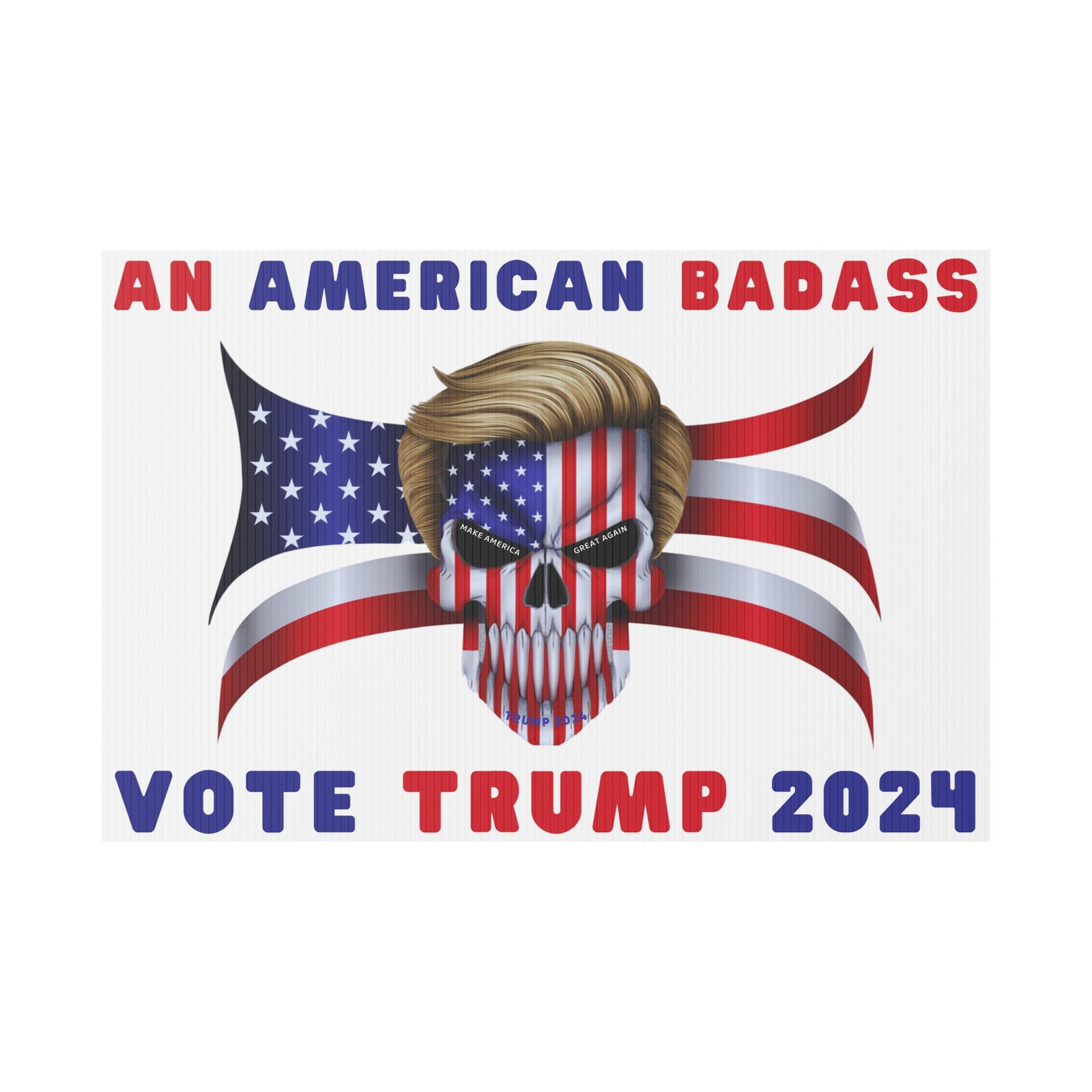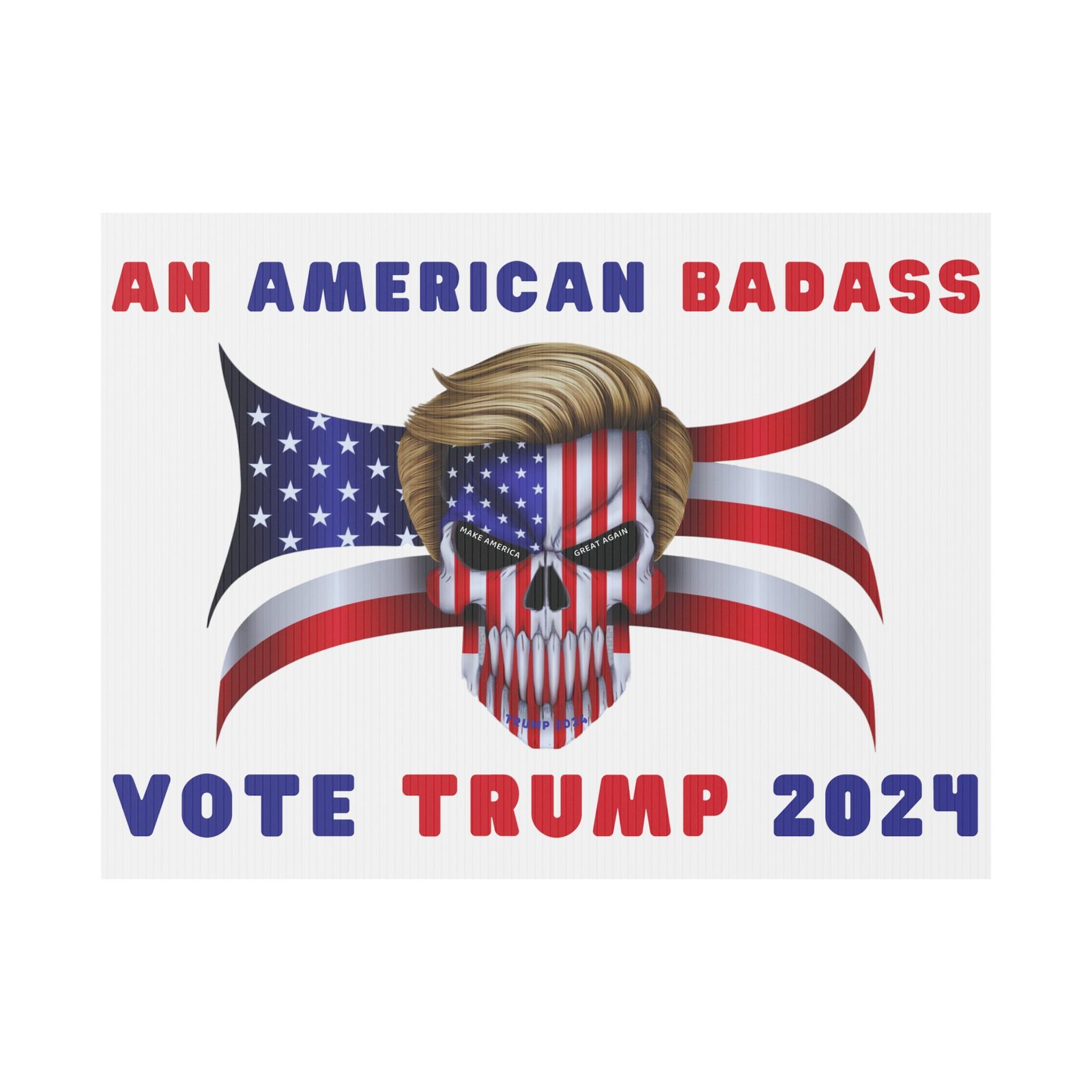 DESIGN: The text “AN AMERICAN BADASS” and “VOTE TRUMP 2024″ in red and blue. An illustration of a skull with the American Flag embedded into it. The skull has President Donald J. Trump’s iconic blonde hairstyle. Colors are red, white, blue, black, and gold. Show your style with a super cool yard sign showing your support for President Trump!