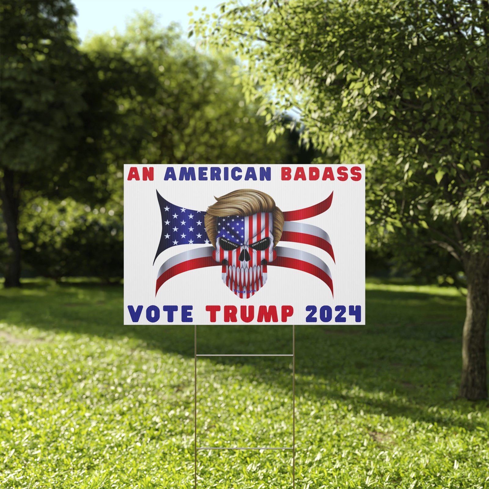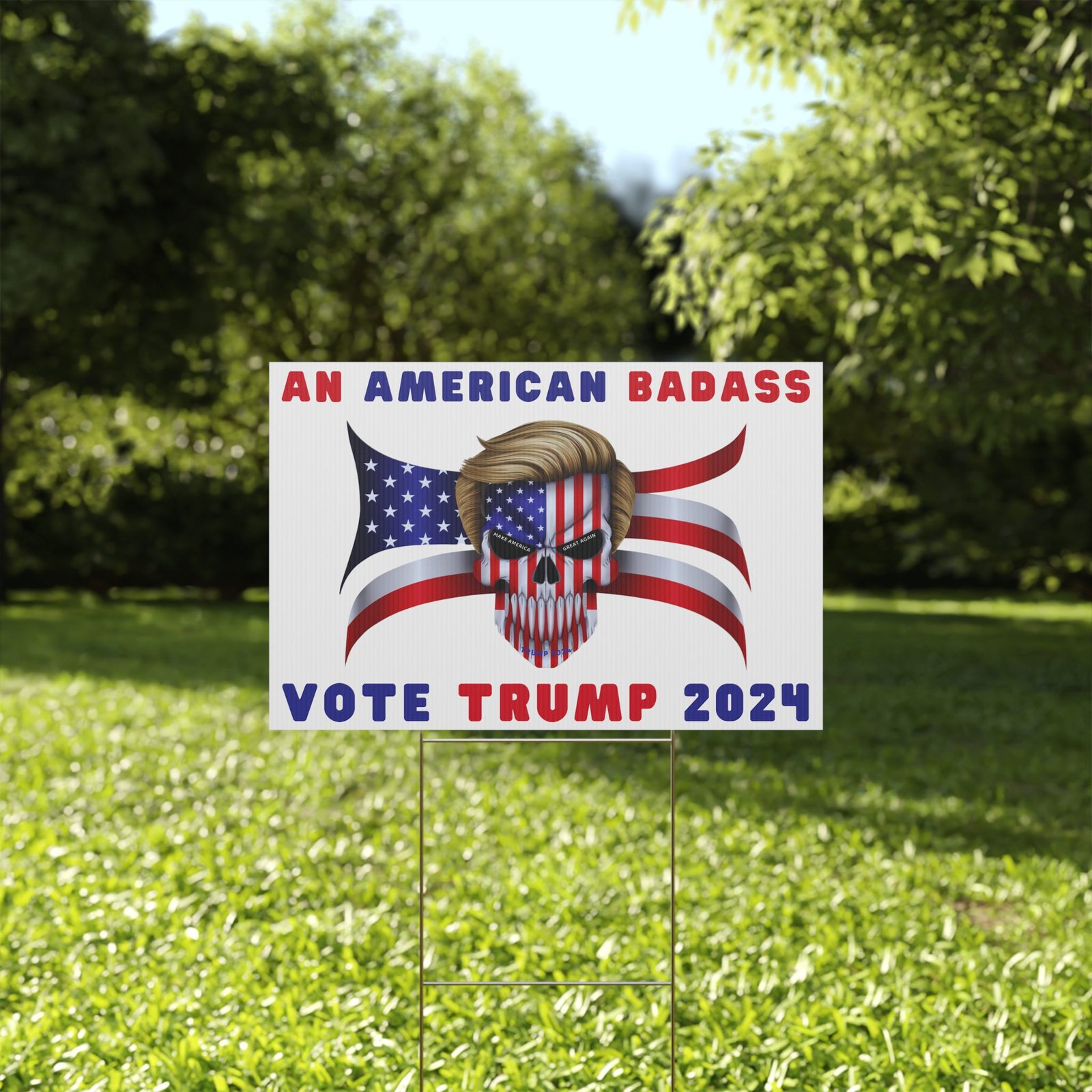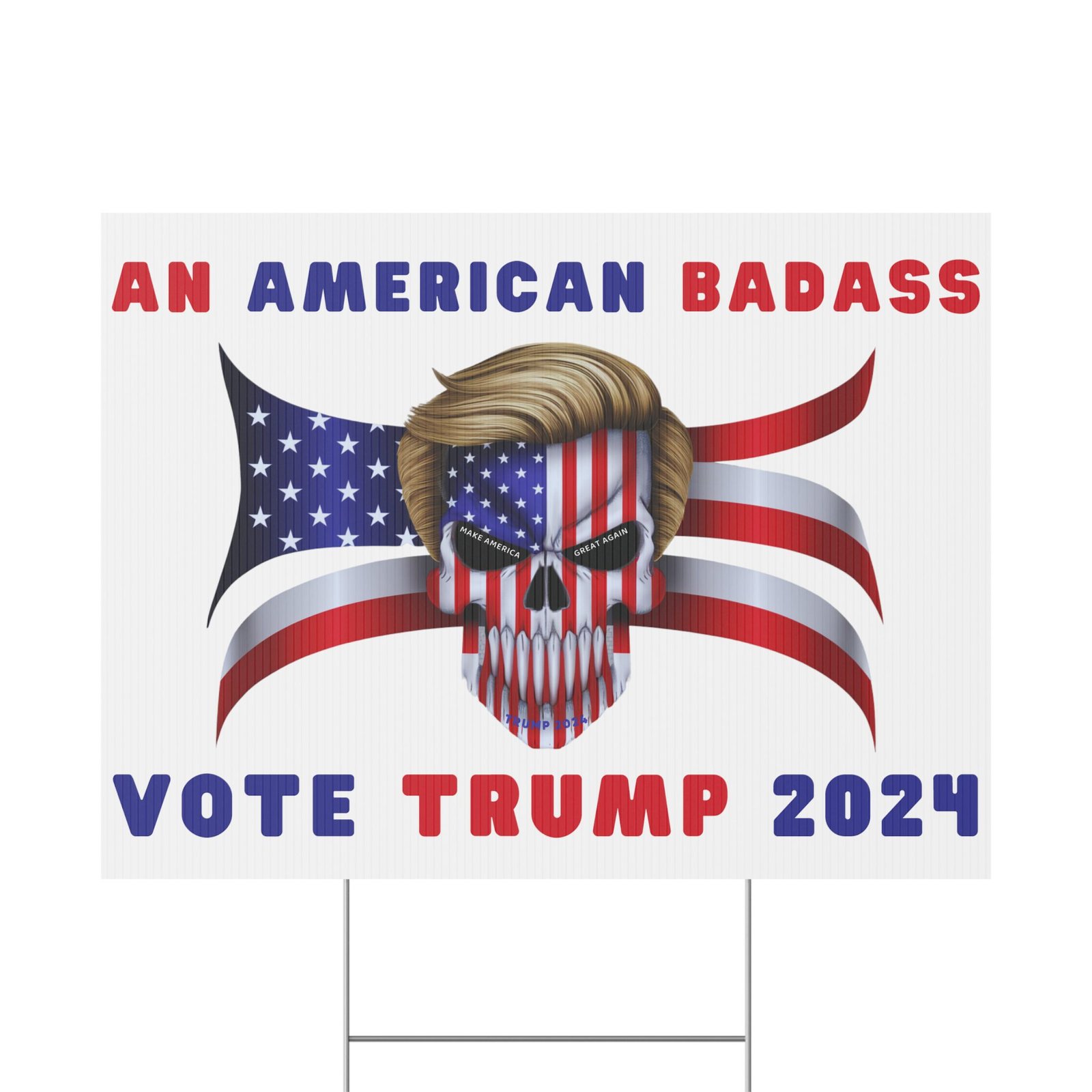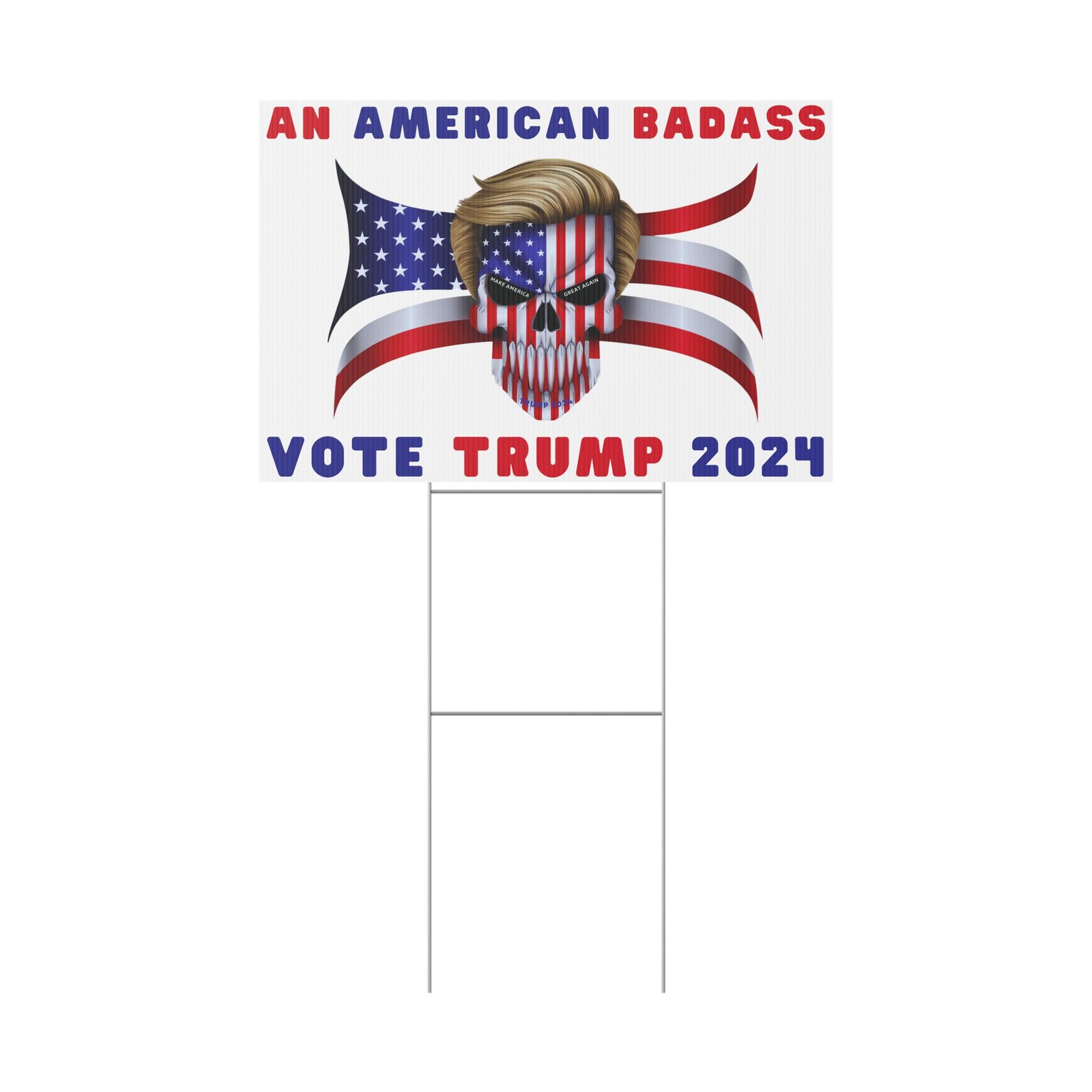 DESIGN: The text “AN AMERICAN BADASS” and “VOTE TRUMP 2024″ in red and blue. An illustration of a skull with the American Flag embedded into it. The skull has President Donald J. Trump’s iconic blonde hairstyle. Colors are red, white, blue, black, and gold. Show your style with a super cool yard sign showing your support for President Trump!