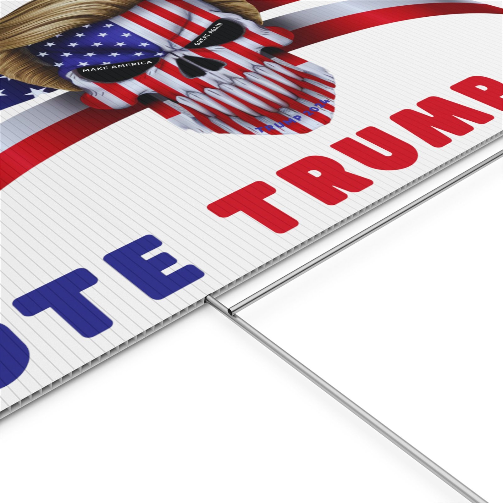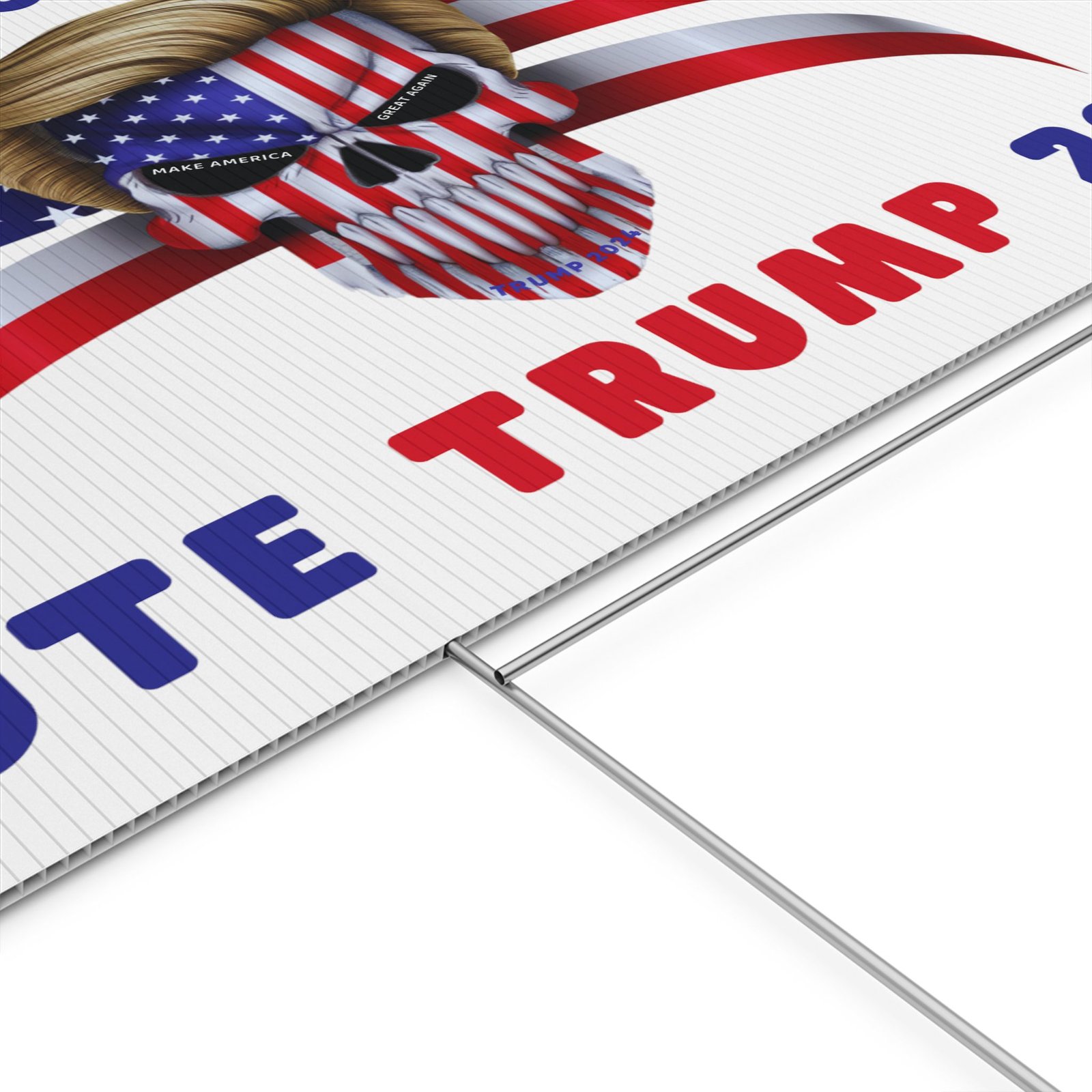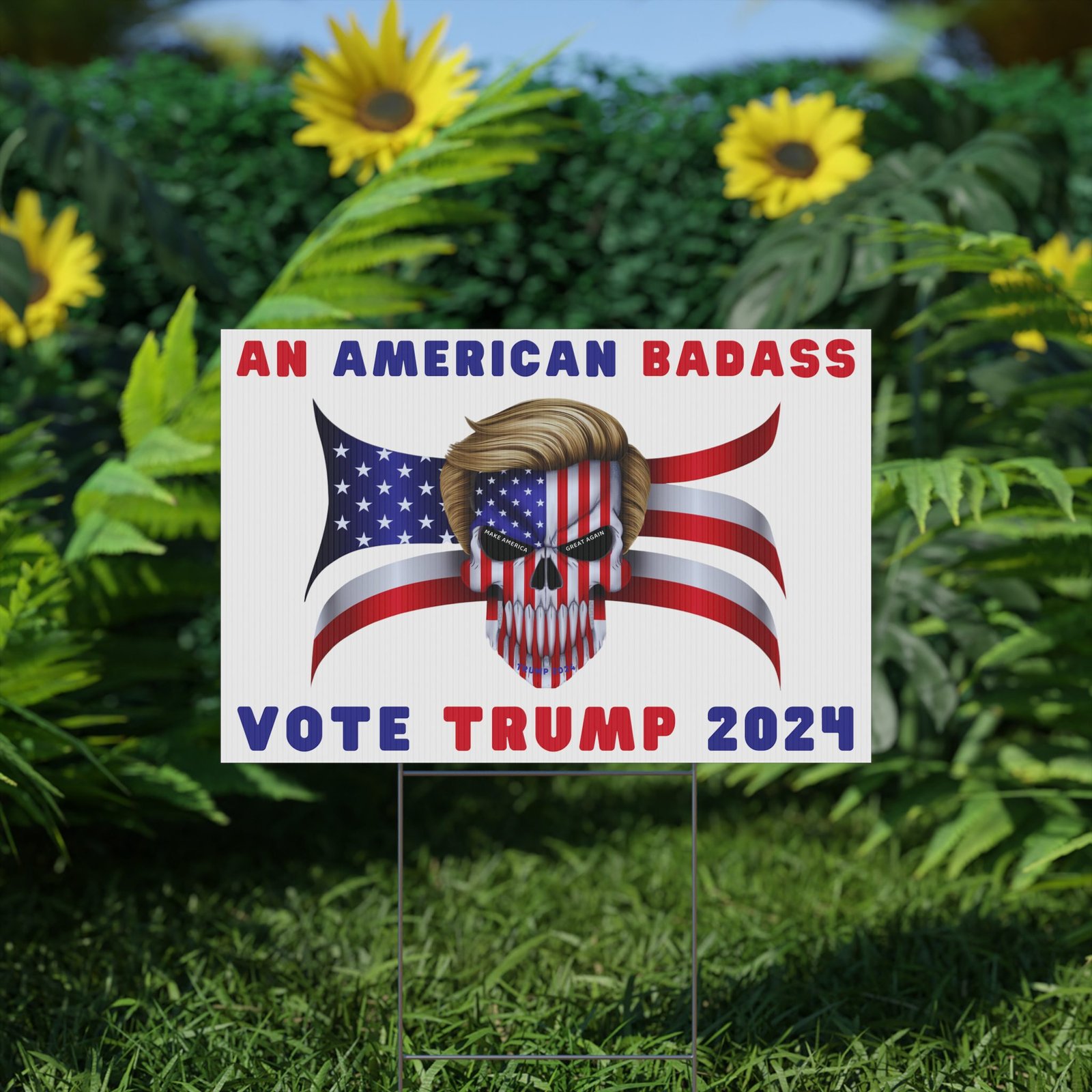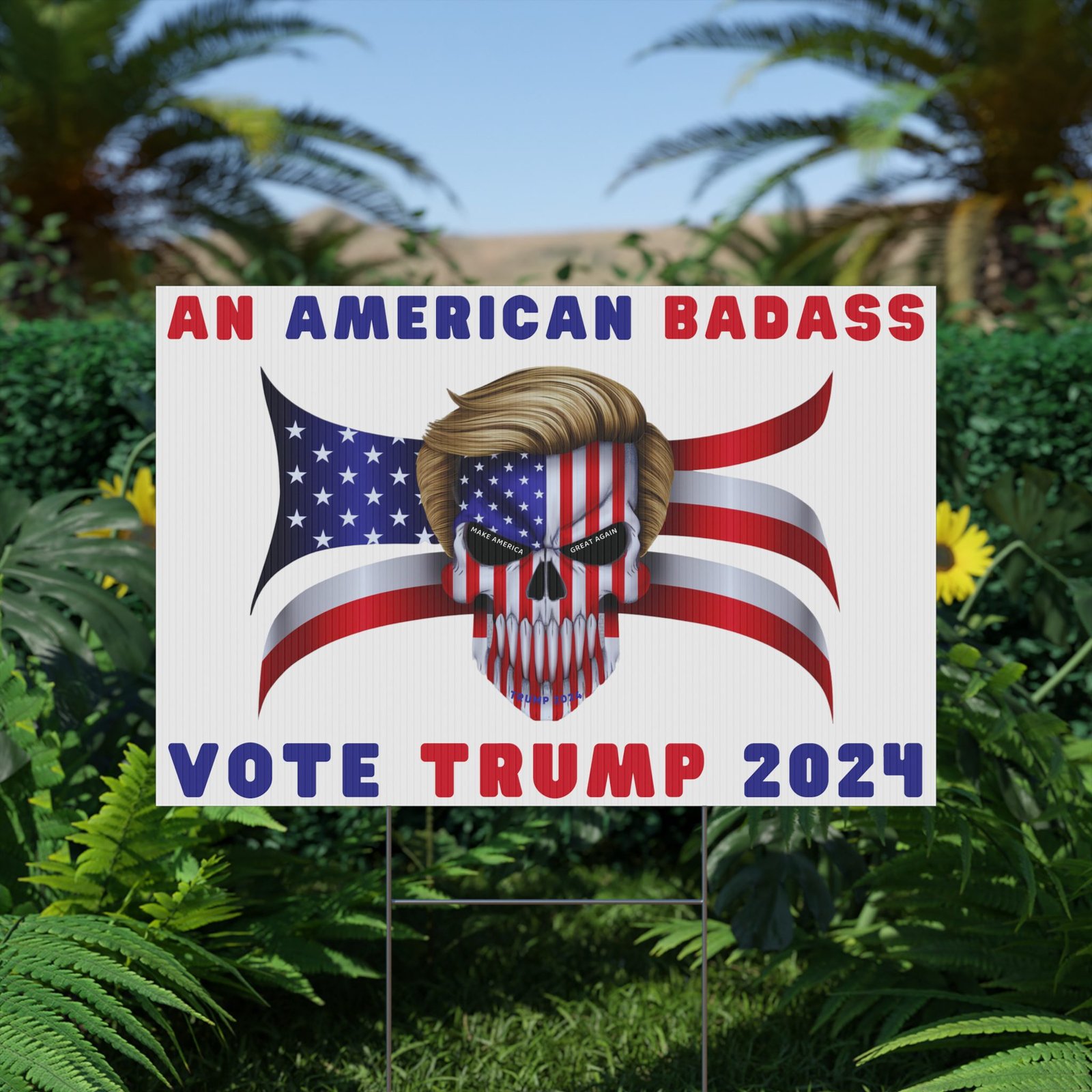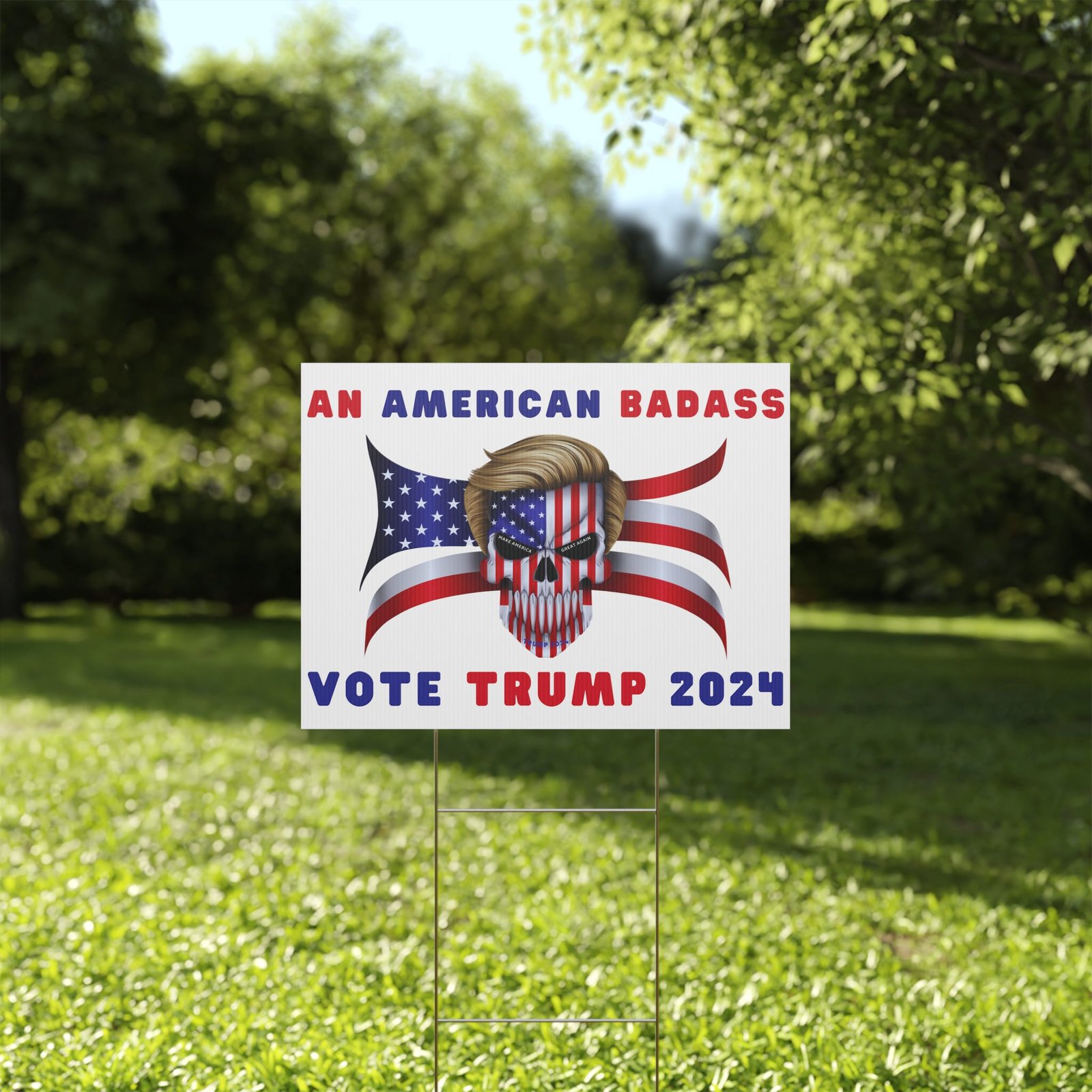 DESIGN: The text “AN AMERICAN BADASS” and “VOTE TRUMP 2024″ in red and blue. An illustration of a skull with the American Flag embedded into it. The skull has President Donald J. Trump’s iconic blonde hairstyle. Colors are red, white, blue, black, and gold. Show your style with a super cool yard sign showing your support for President Trump!